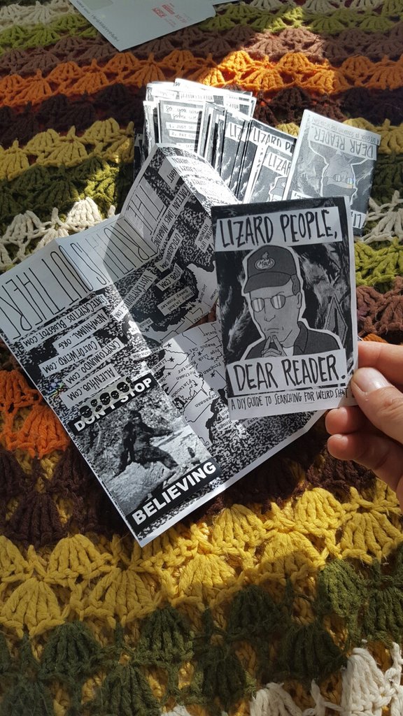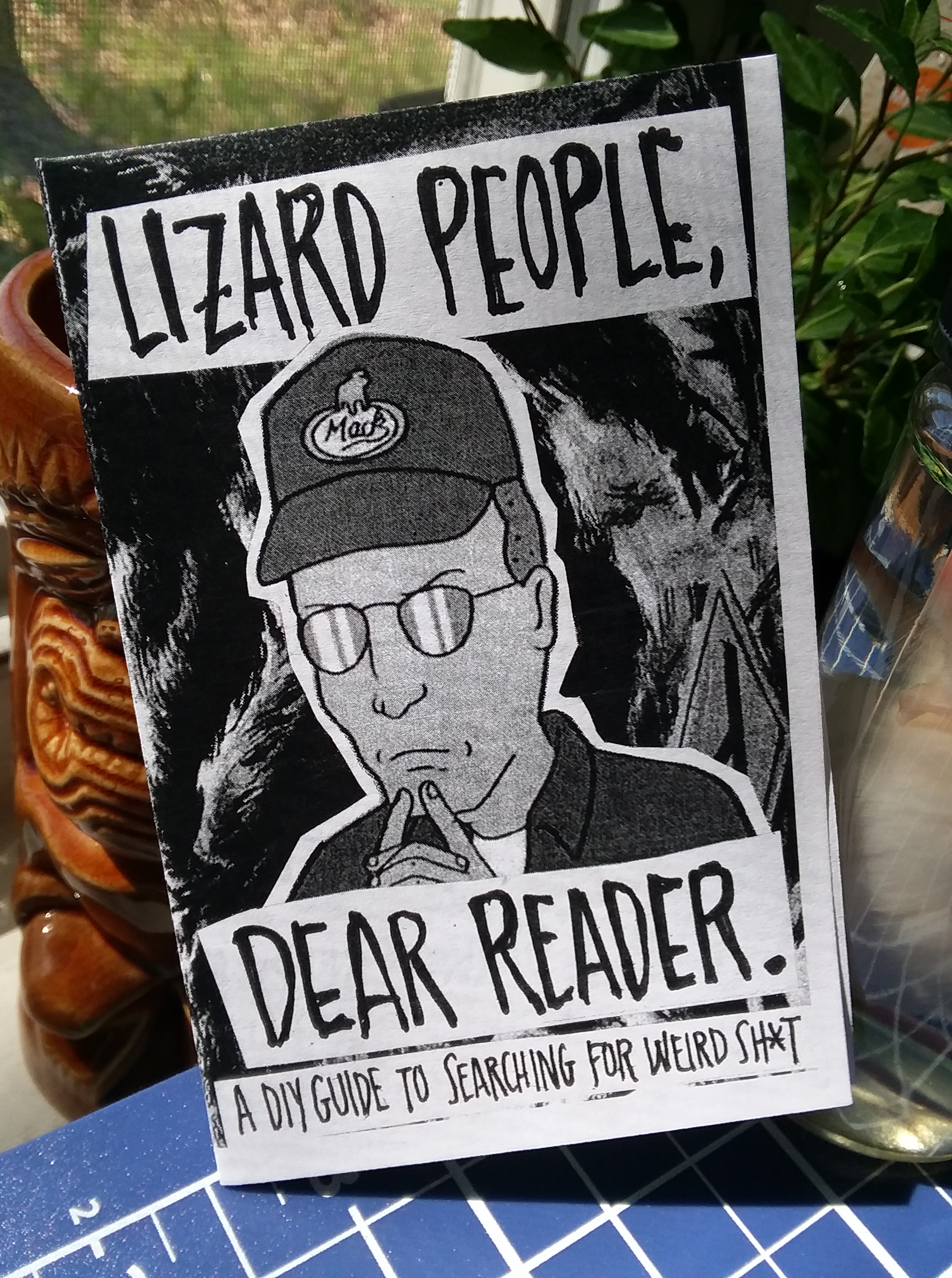 ...and this zine can help you find it! LIZARD PEOPLE, DEAR READER is a do-it-yourself guide to the search for and tracking of any weird shit you might hope to encounter in your neck of the woods. This handy-dandy mini is small enough to fit in your jacket pocket and will help you figure out if those lights in the sky are actually a UFO or just an overzealous plane, and what you should do if you find evidence of mysterious poop.