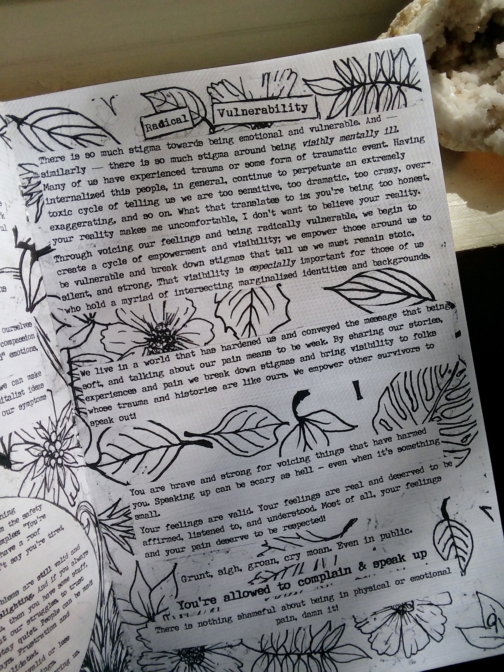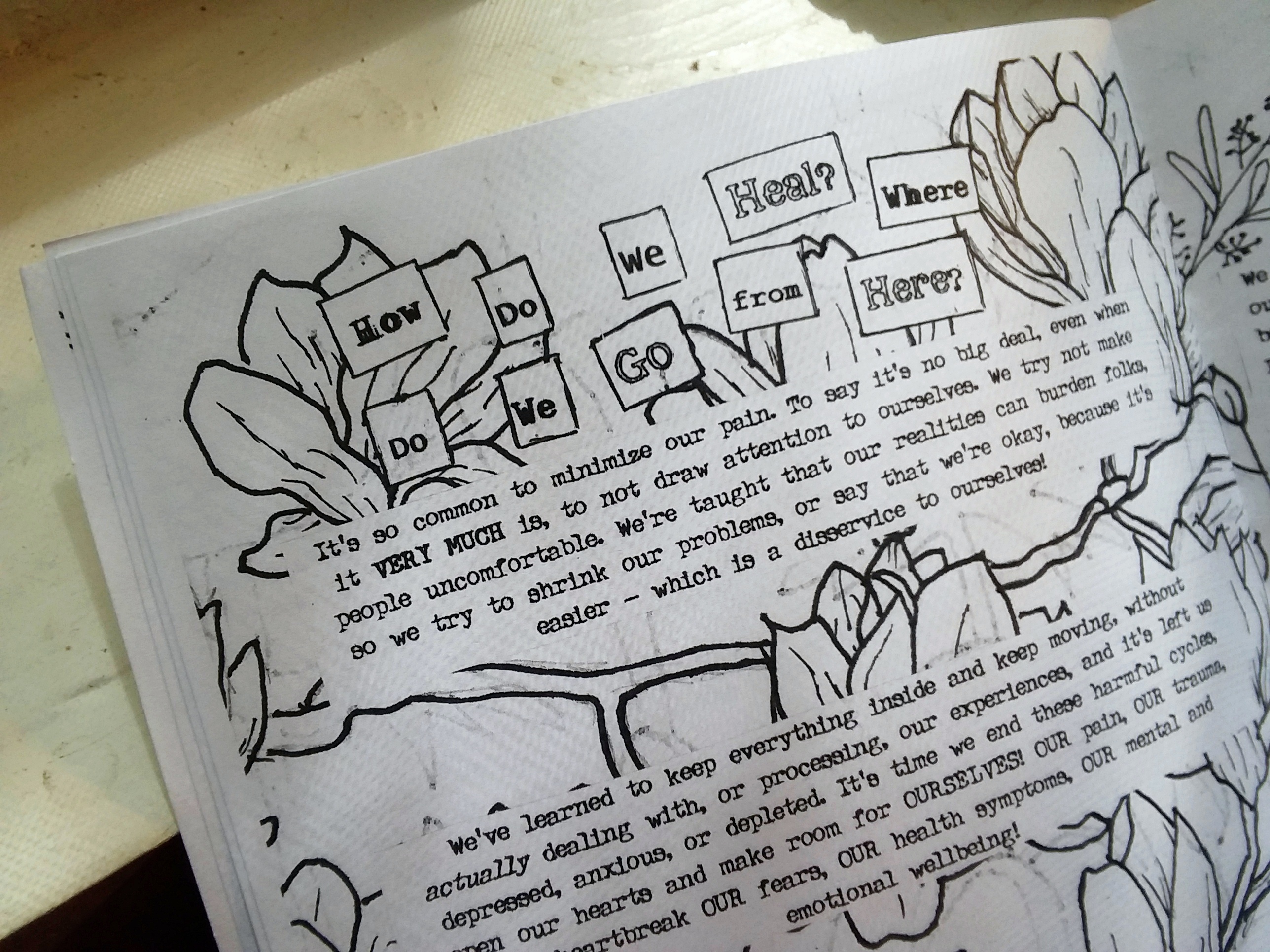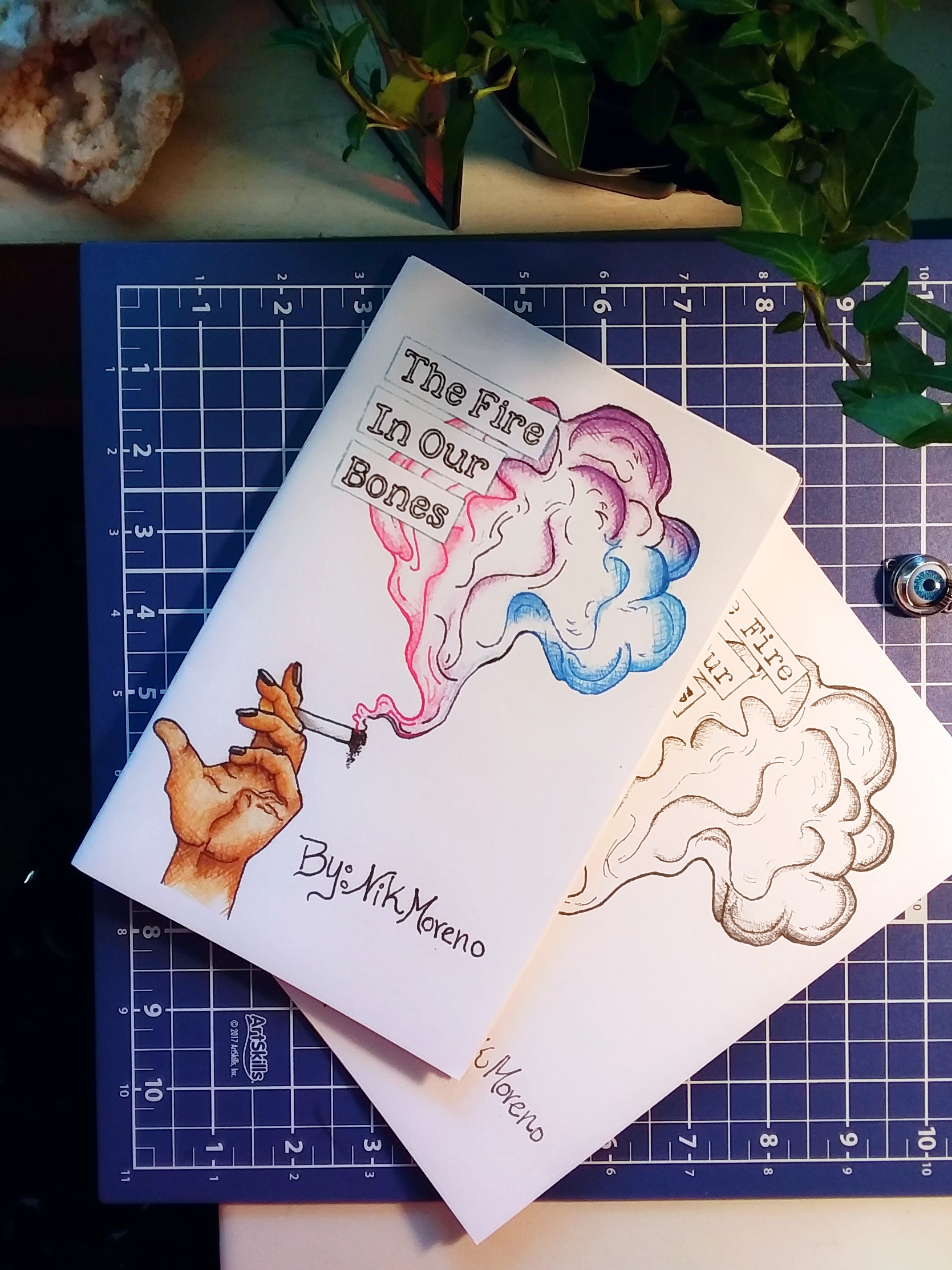 By Nik Moreno. This zine is 20 pages, half size (5.5 x 8.5), typed, b&w, with cardstock covers & hand-drawn backgrounds