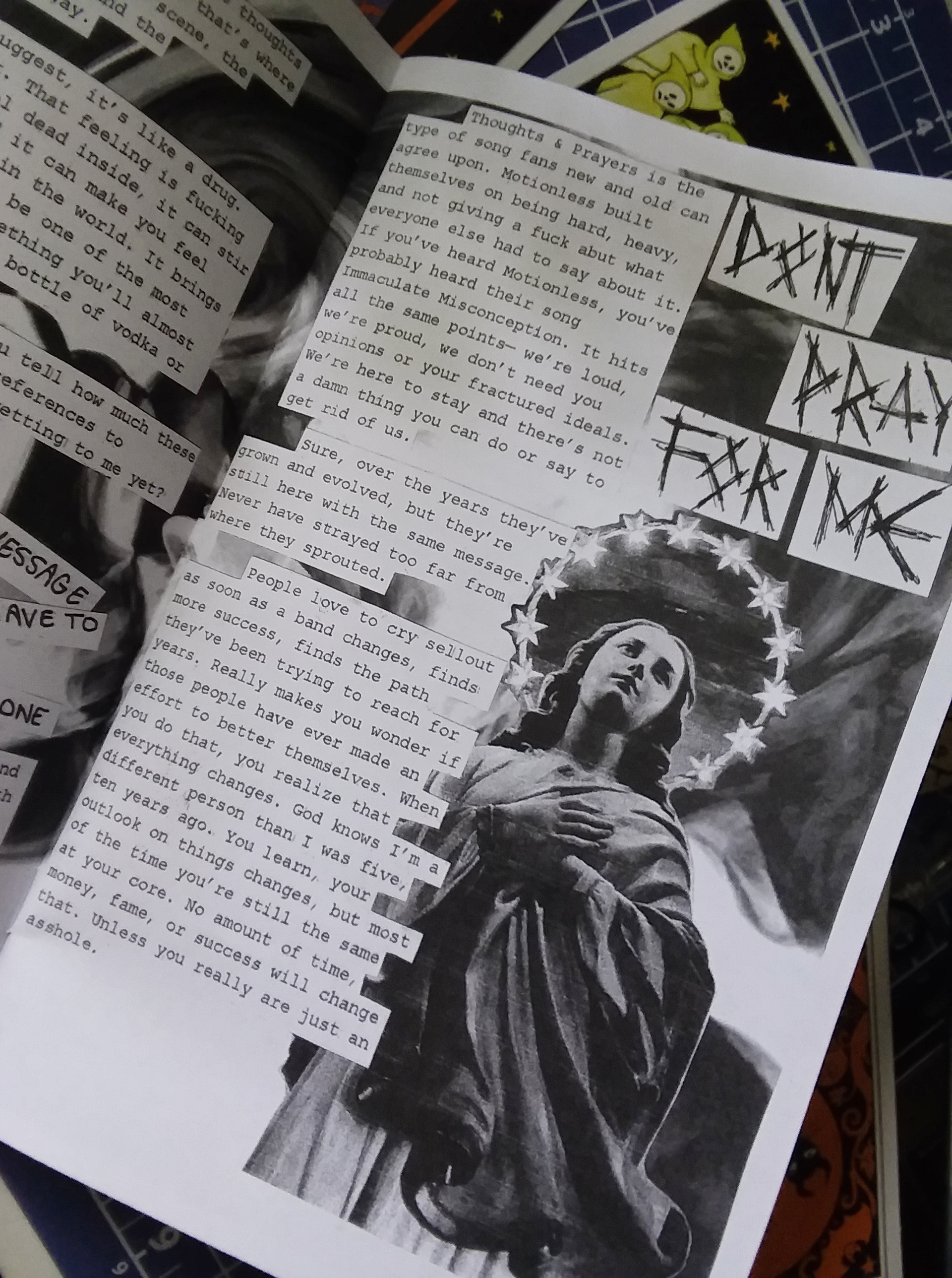 This zine is 16 pages, half size (5.5 x 8.5), b&w, typed, and fully collaged!
