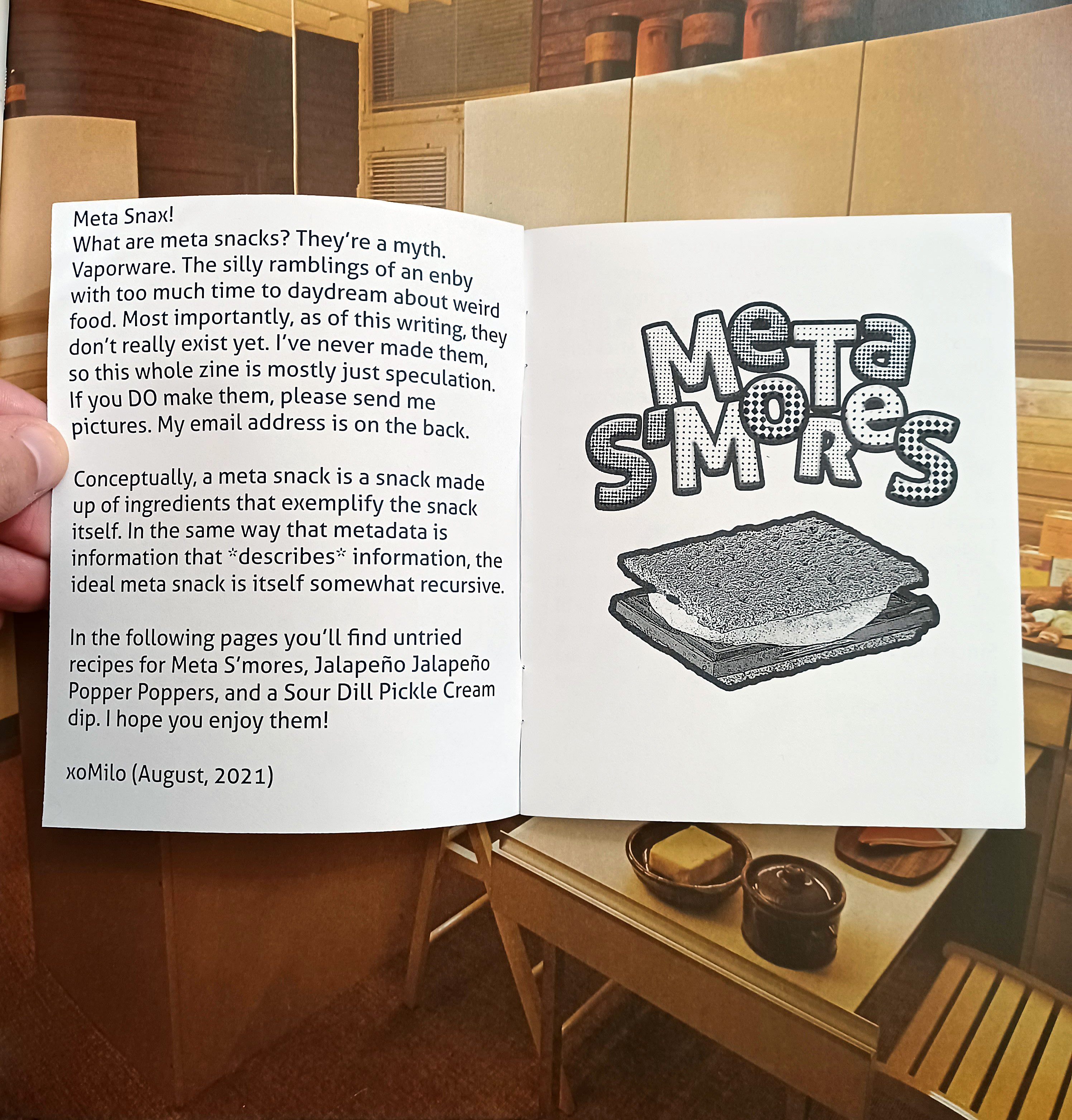 Another fun one from Milo! Metasnax is an exploration of mythical snacks, snacks about snacks, snacks made from snacks--recursive snacks, vaporsnacks, whatever we wanna call them. Inside you'll find mind-expanding recipes for Meta S'mores, Jalapeno Jalapeno Popper Poppers, and Sour Dill Pickle Cream dip that'll make you think about food (and data) different.