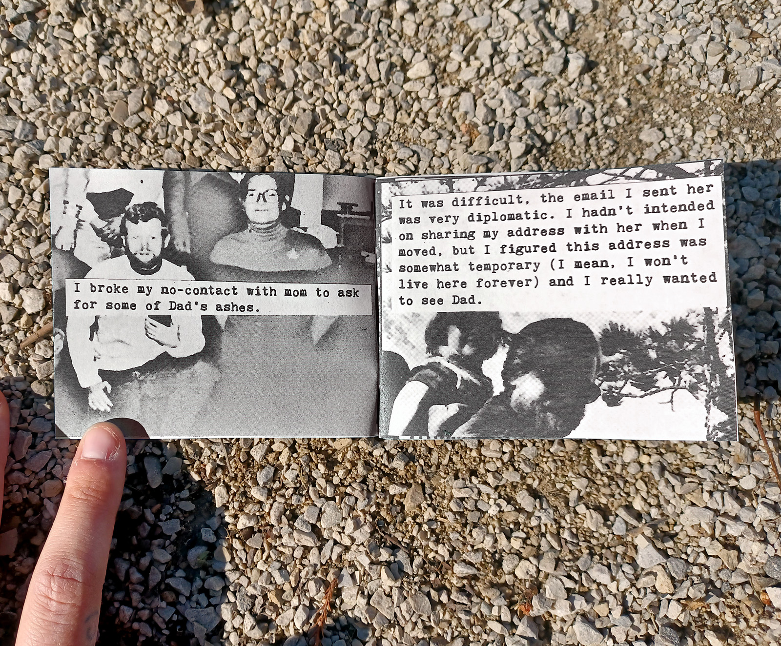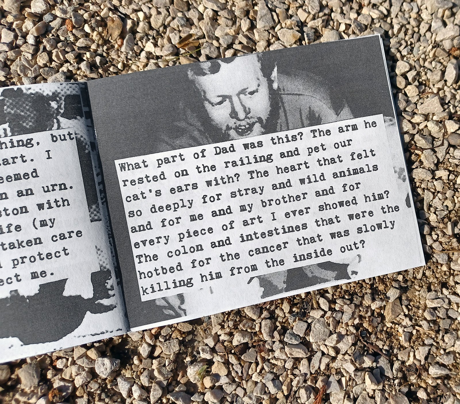 This zine is 20 pages, eighth legal-ish (3 x 3.875), typed, and full of family photos. Obvious grief warning for parental death.
