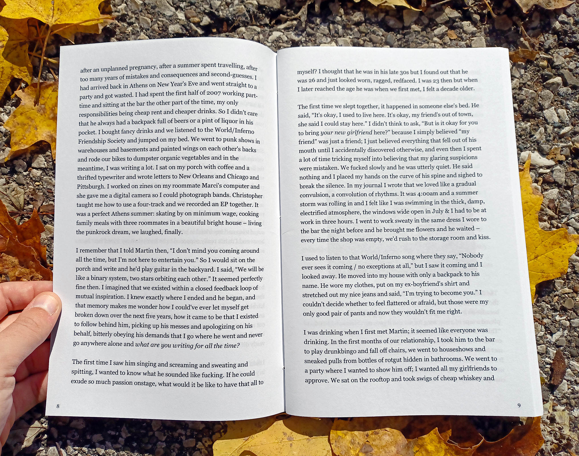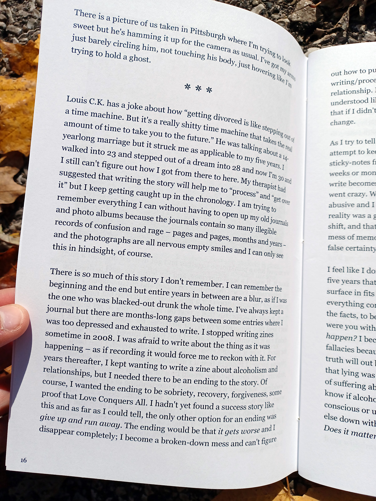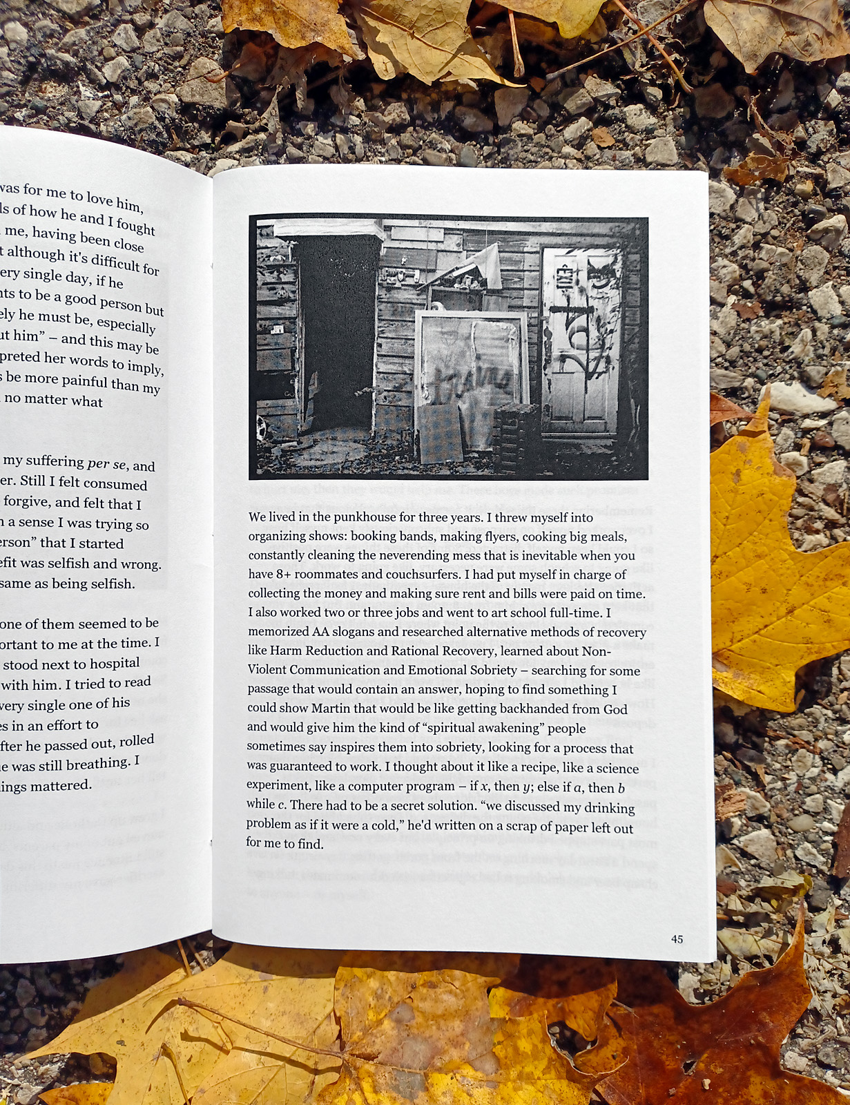 By Stacey-Marie Piotrowski. Half size (5.5 x 8.5), typed, thread-bound & super text-heavy with some b&w photos/illustrations, and comes with trigger warnings for abuse, alcoholism, and drug use. Stay safe out there, babies.