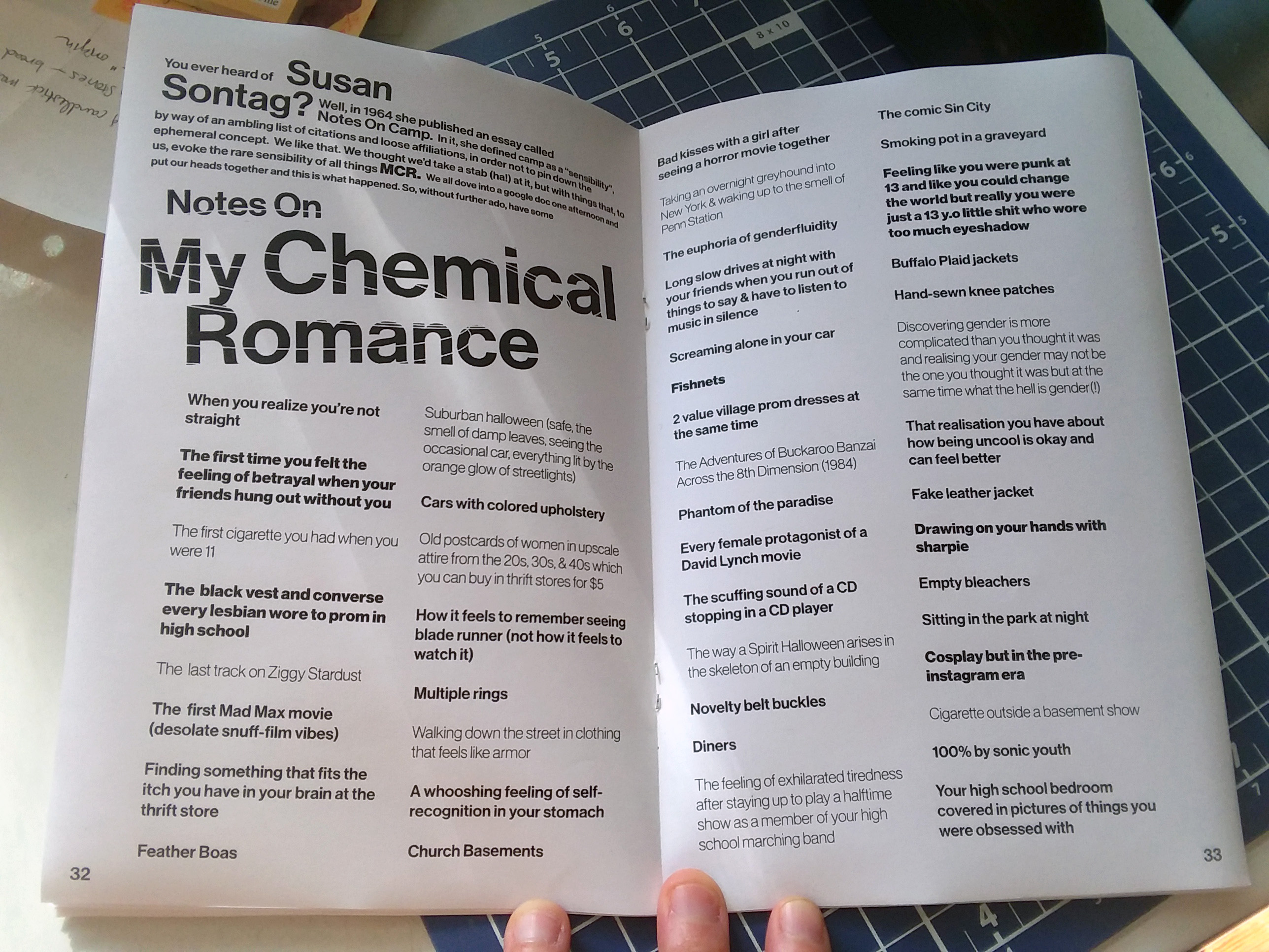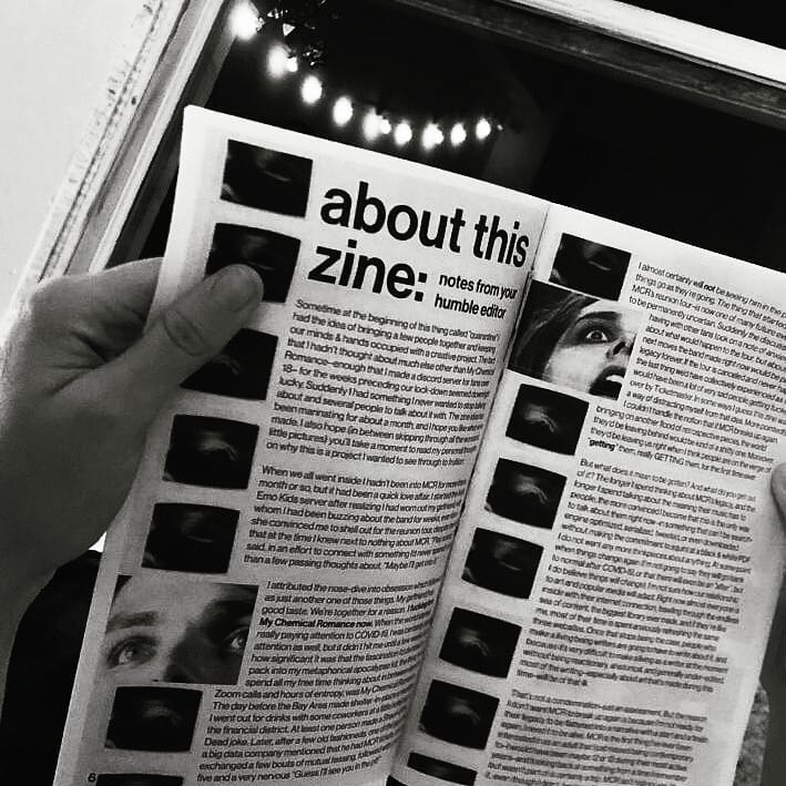 64-page My Chemical Romance fanzine by the Adult Emo Kids Discord Server, completed during the plague times. Essays, comics, art, collages, reflection, goofy and serious and beautiful and dramatic.