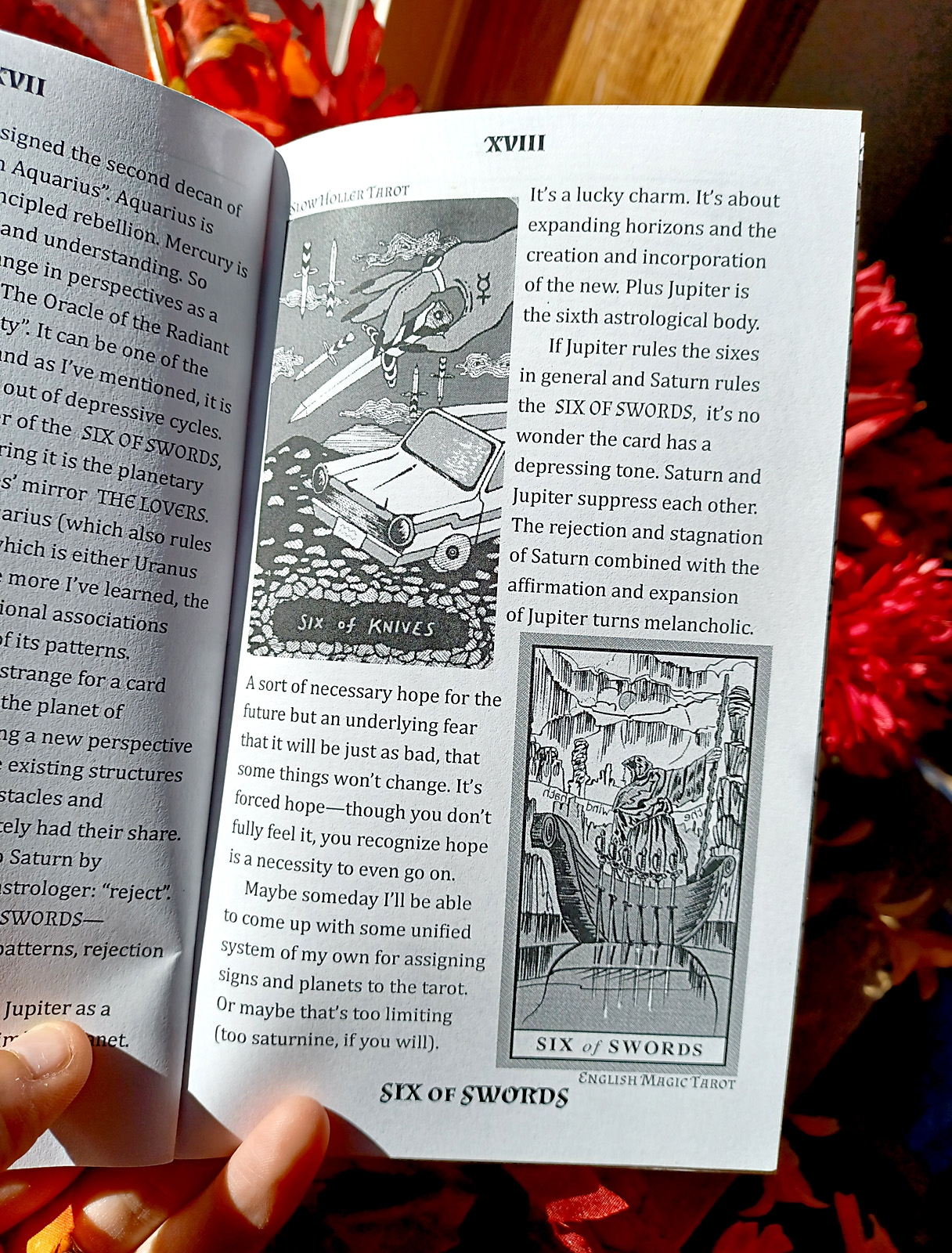 Drawing Room Tarot is a zine exploring individual tarot cards and their related symbolism. It's also got some perzine stuff as I talk about how it relates to my life. More than a list of keywords (but still accessible for beginners!)