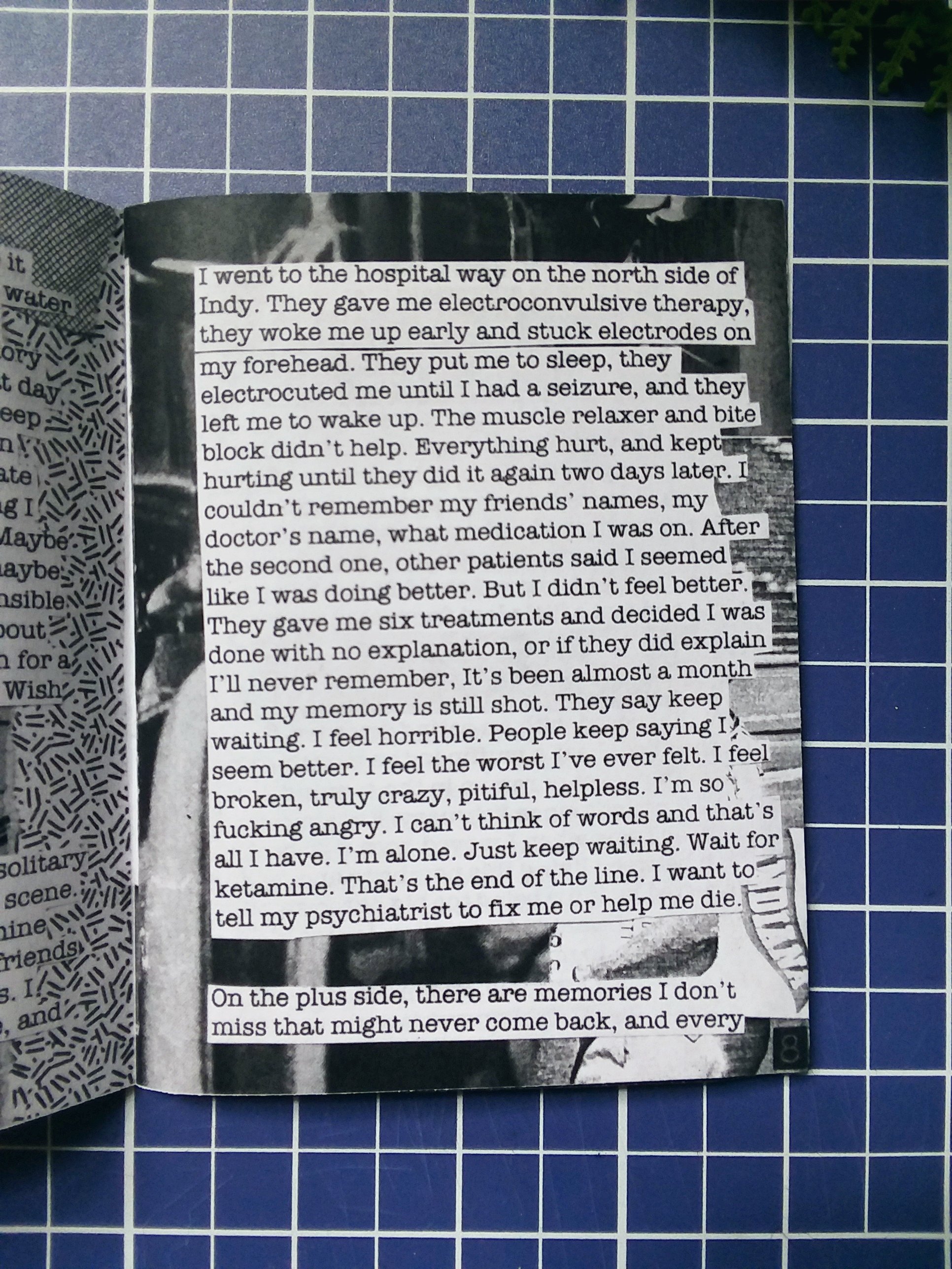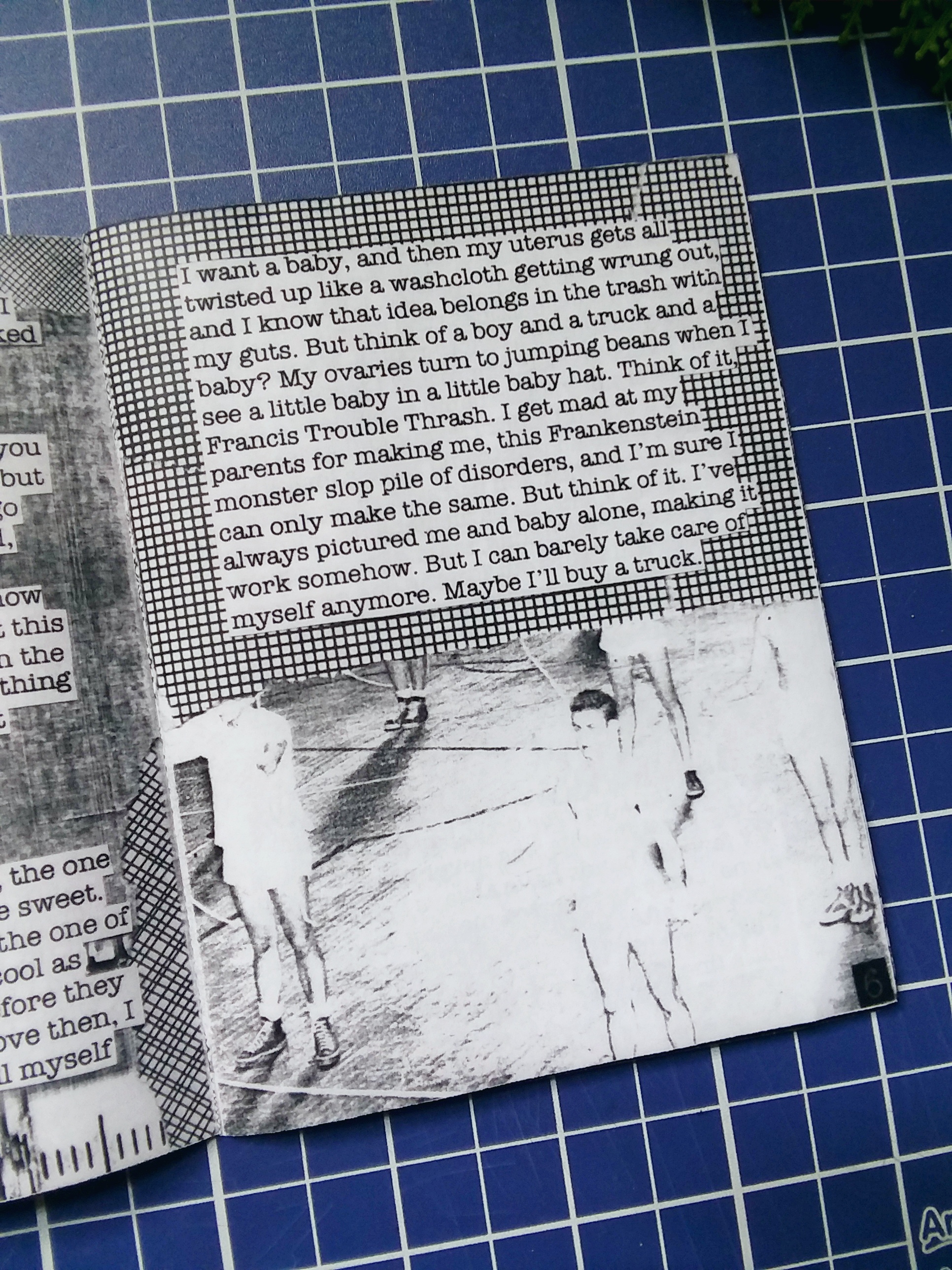 This zine is 20 pages, quarter size (4.25 x 5.5), typed, fully collaged, and photocopied.