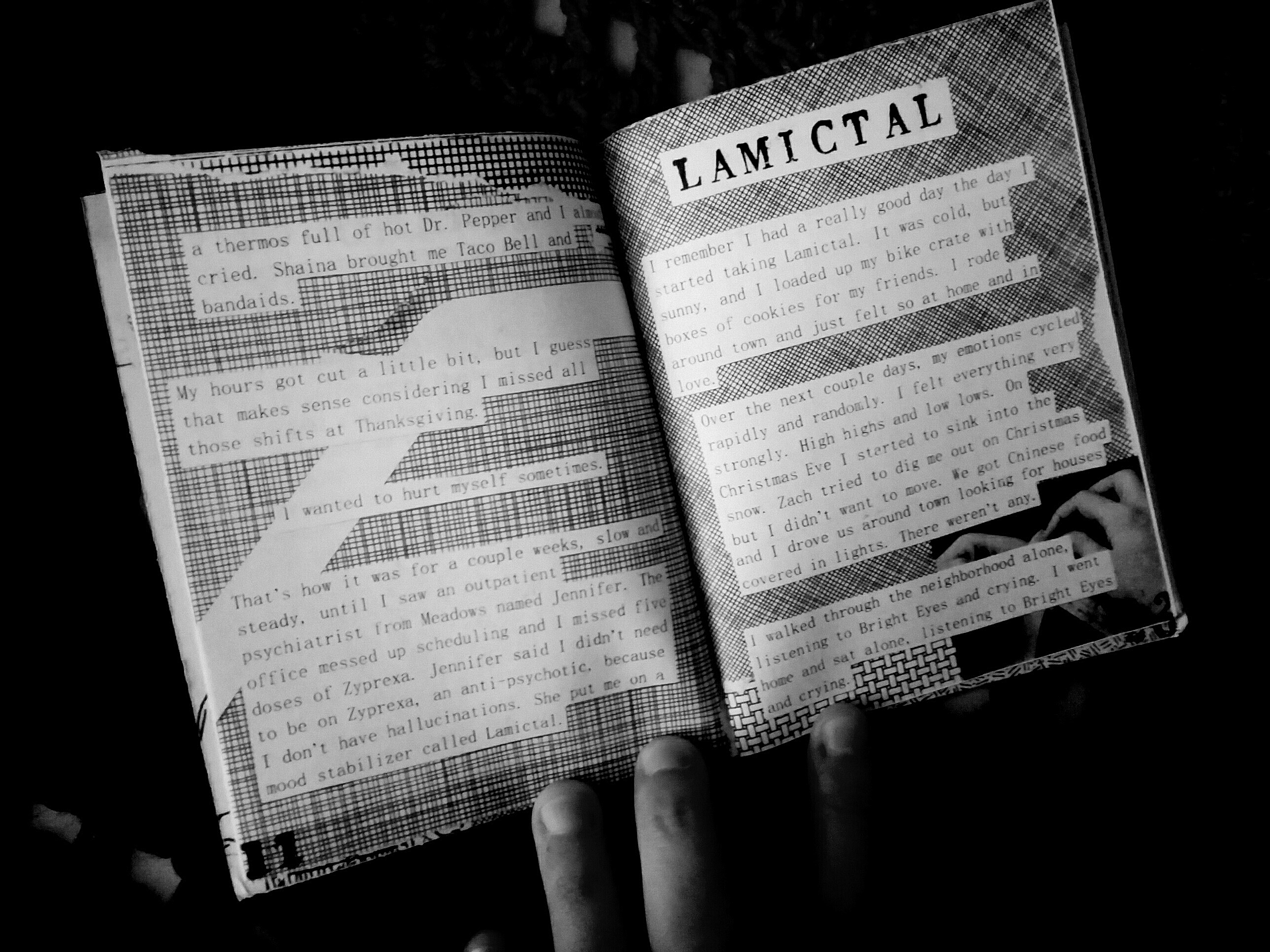15 med changes in 2 months, going in & out of inpatient & transitional care, struggling & leaning on friends & laying on the couch a lot & having the courage (or simply being so far out of fucks you have none left to devote to shame) to share the whole brutal experience with the zine-reading public. There's solidarity in the ups & downs & discord. You're not in this alone. Aggie has survived it, and so can you.