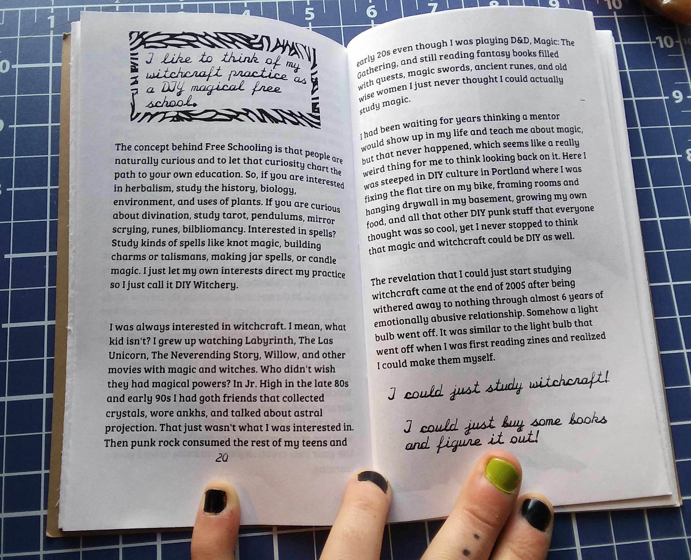 A fantastically-constructed and informative witchy zine from Alex Wrekk, five star perzinester. You won't find spells or correspondences here, but the actual beliefs and whys of Alex's practice--what led her to secular witchcraft, building her practice while recovering from a shitty relationship, her DIY ethos and how punk life has shaped her practice.