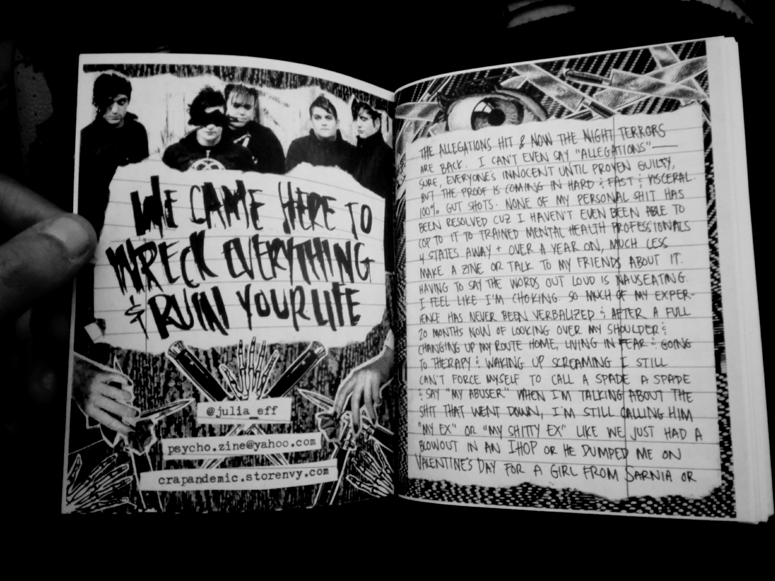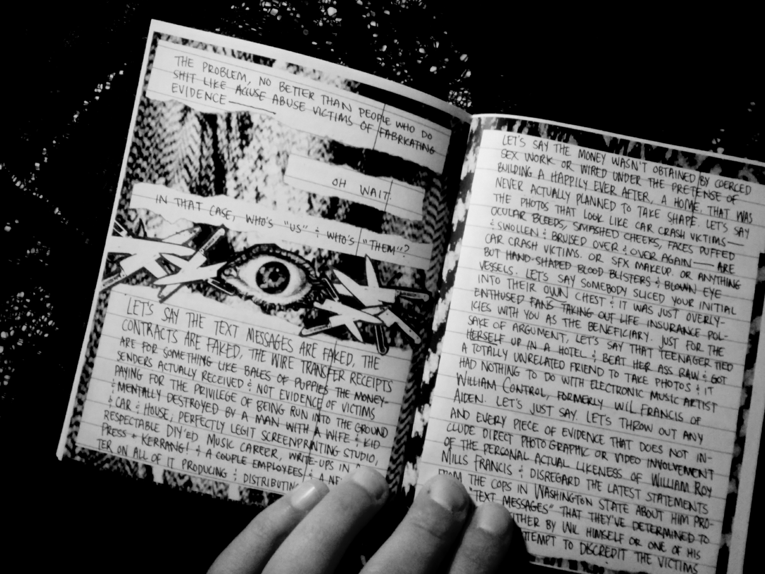 This is a zine about William Control/Wil Francis, the allegations of serious abuse against him, and what it means to be a fan. It's about revenge and rage and screamo and wanting the world to be a better place through any means necessary. It's about how I met a guy, fell in love with him, let him into my home and lived in fear of him for 3 1/2 years and loved him wholeheartedly while he treated me like shit until I escaped, leaving behind even some of my own possessions and then how I sat by in terror while he heaped insane behavior on my former place of employment and told morning radio shows that I'd robbed him blind.