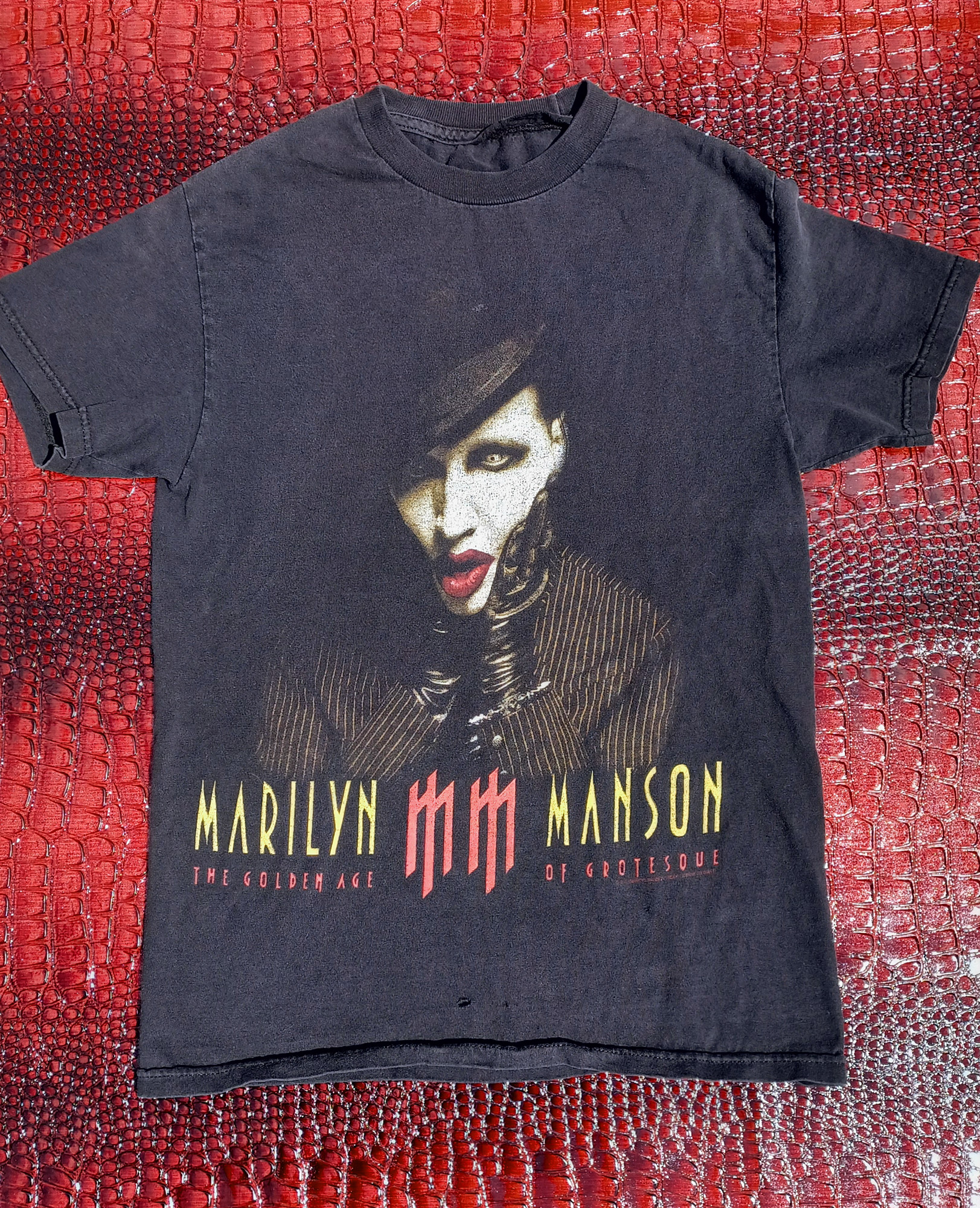 Vintage, classic Golden Age of Grotesque tee featuring a full-color print of Mr. Manson looking startled to be here and maybe just a little bit cross-eyed. No tag size (tag missing), but it fits like a small.
