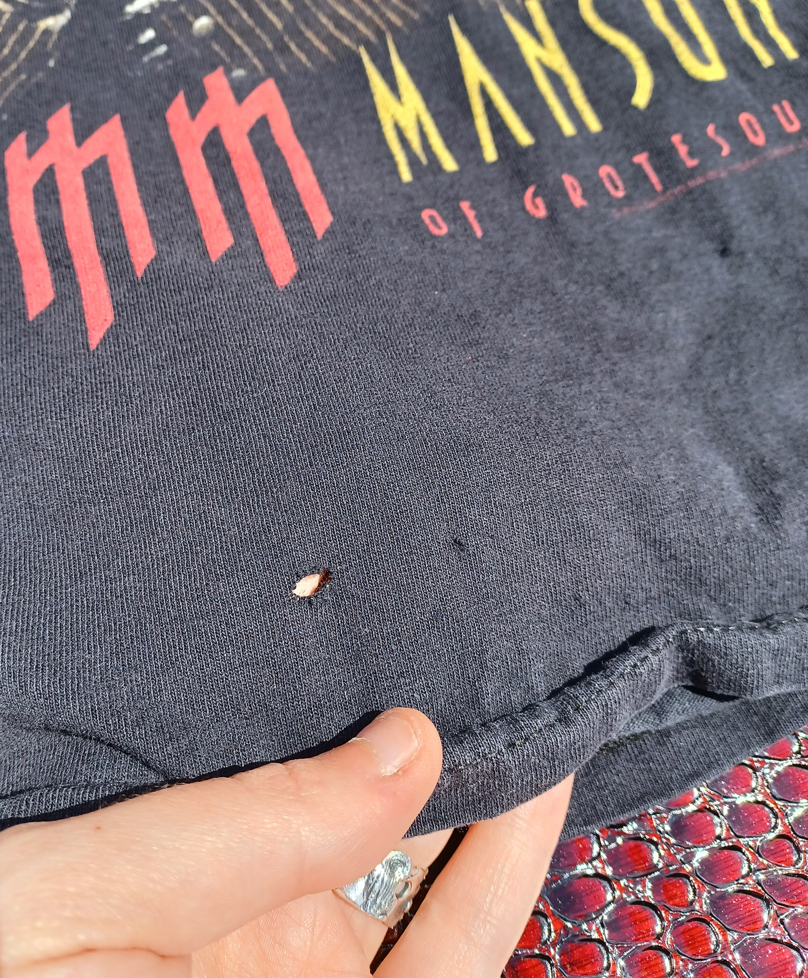 HEADS UP! There's two belt-line holes in the bottom front of this tee (see photo) and a pinhole under the right side of the print (see other photo), but otherwise remarkably good condition!