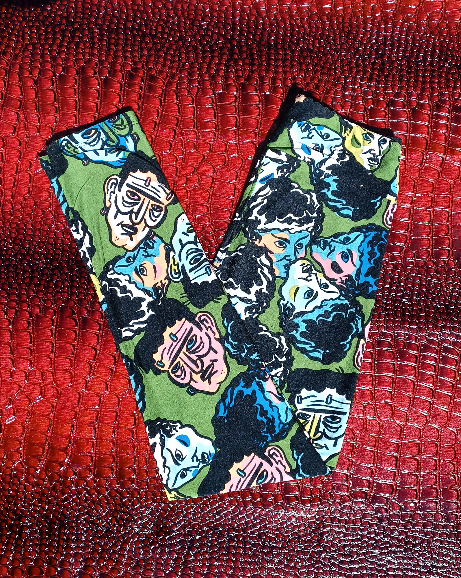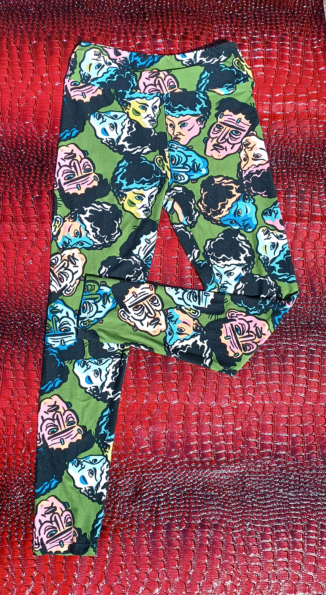 Midcentury-style portraits of Frankenstein & the Bride scattered every-which-way on an olive green background. Crazy soft, crazy comfy, one of those pairs of leggings that feels like you're nekkid from the waist down. These rock.