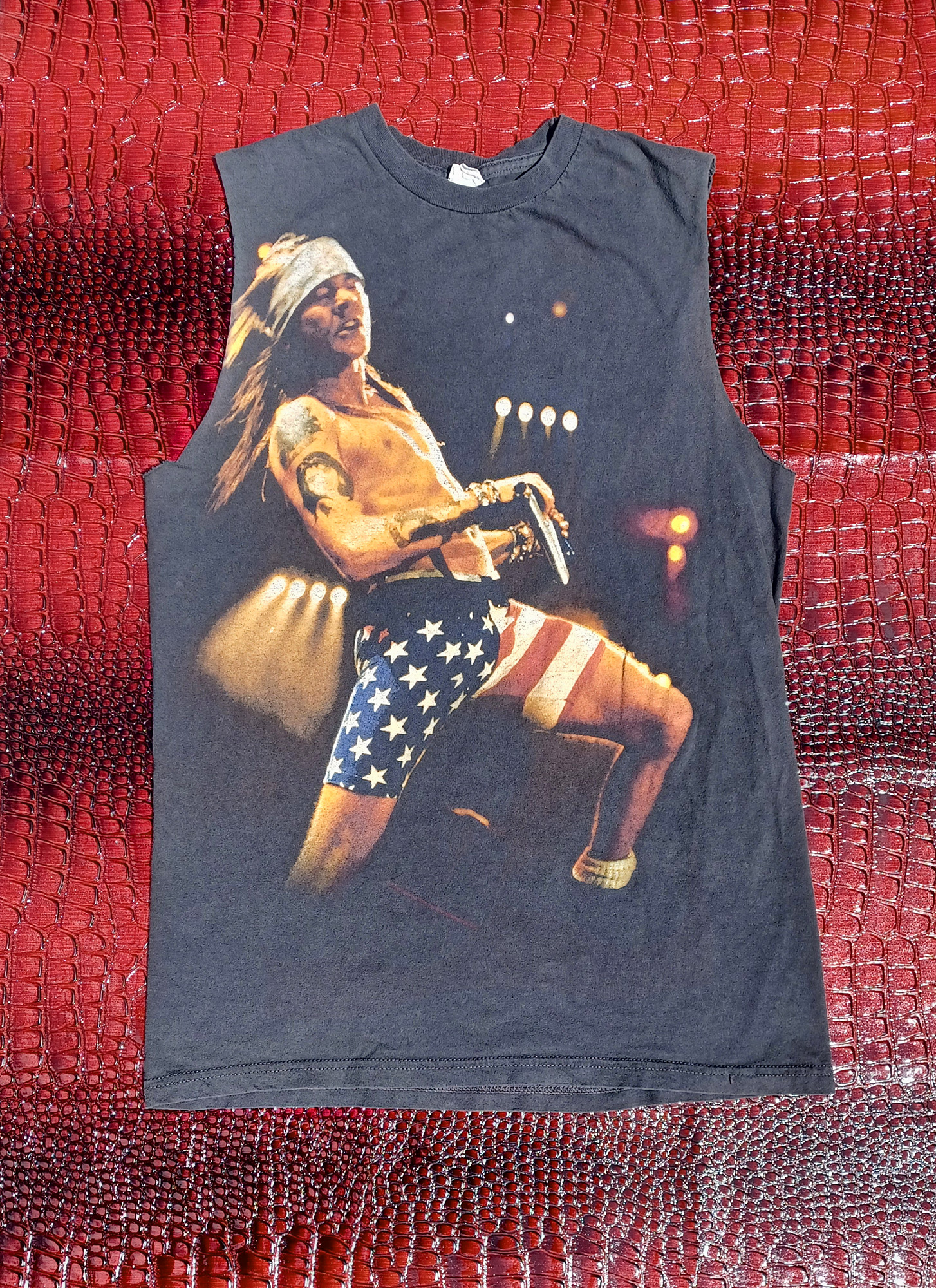 I can't think of a single item of clothing more sleazy than a washed-to-gray cutoff/hardcore shirt/sleeveless/muscle tee--whatever you wanna call it, it's got NO SLEEVES so we're 24/7 ready for the gun show--with Axl Rose dancing his shirtless self across it in his American flag tights. Super soft, stretchy, and breezy; fantastic fit for all your dirtbag dreams.