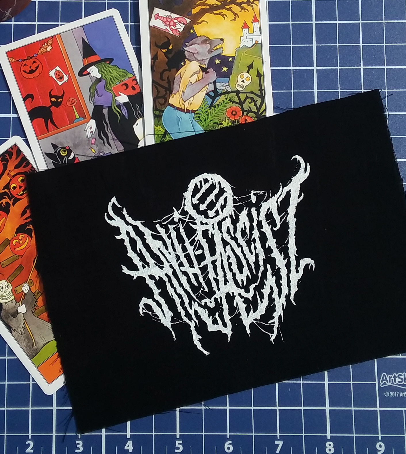 Show your love for metal and hatred for nazi creeps! "Antifascist" spelled out in hand-drawn black metal style text on this screenprinted patch by VeganPatches. White ink on black fabric, heat set, water safe (so wash your pants, you crusty).