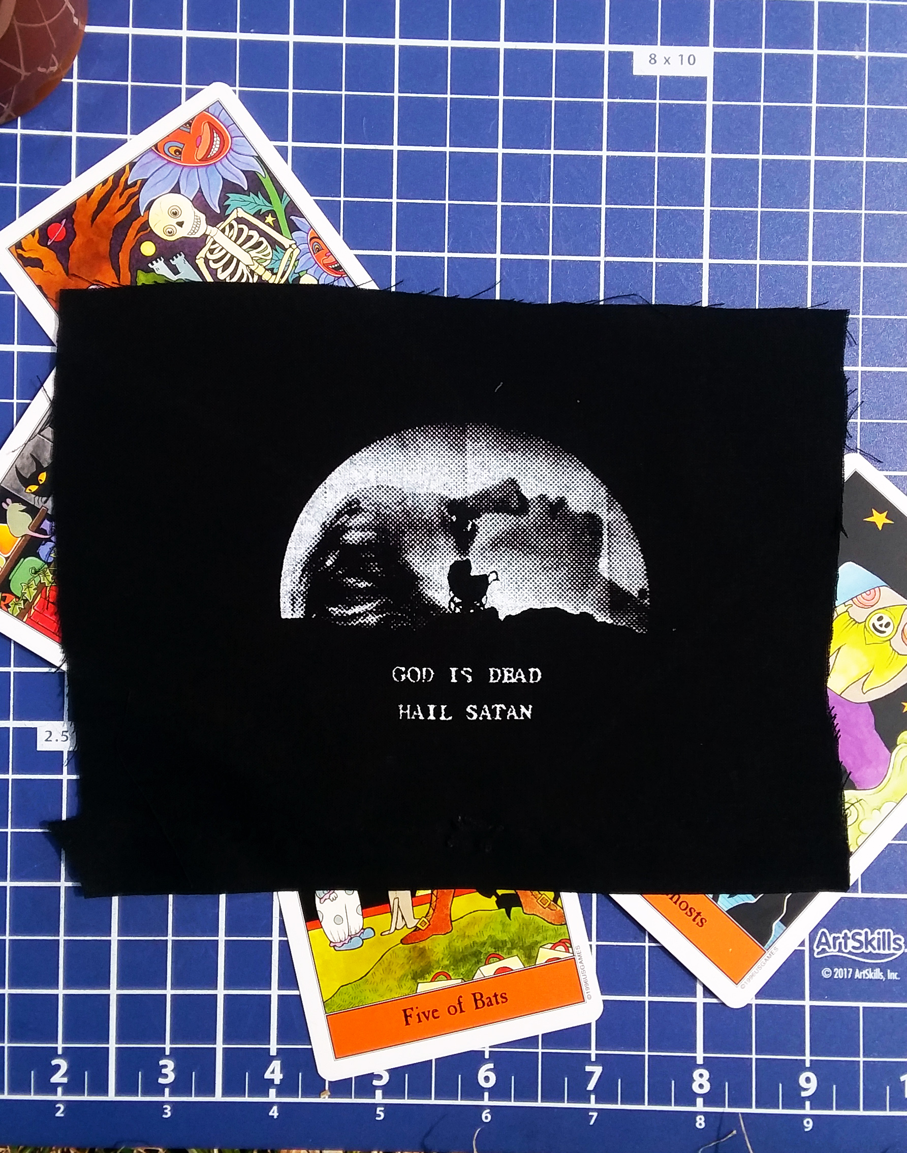 Show your love for the prince of darkness with this Rosemary's Baby-inspired patch, designed & printed with the eeeeevil lurking within by VeganPatches! This one would look great as a chest hit on a vest or zip-up hoodie. White ink on black fabric, heat set, water safe (so wash your pants, you crusty).