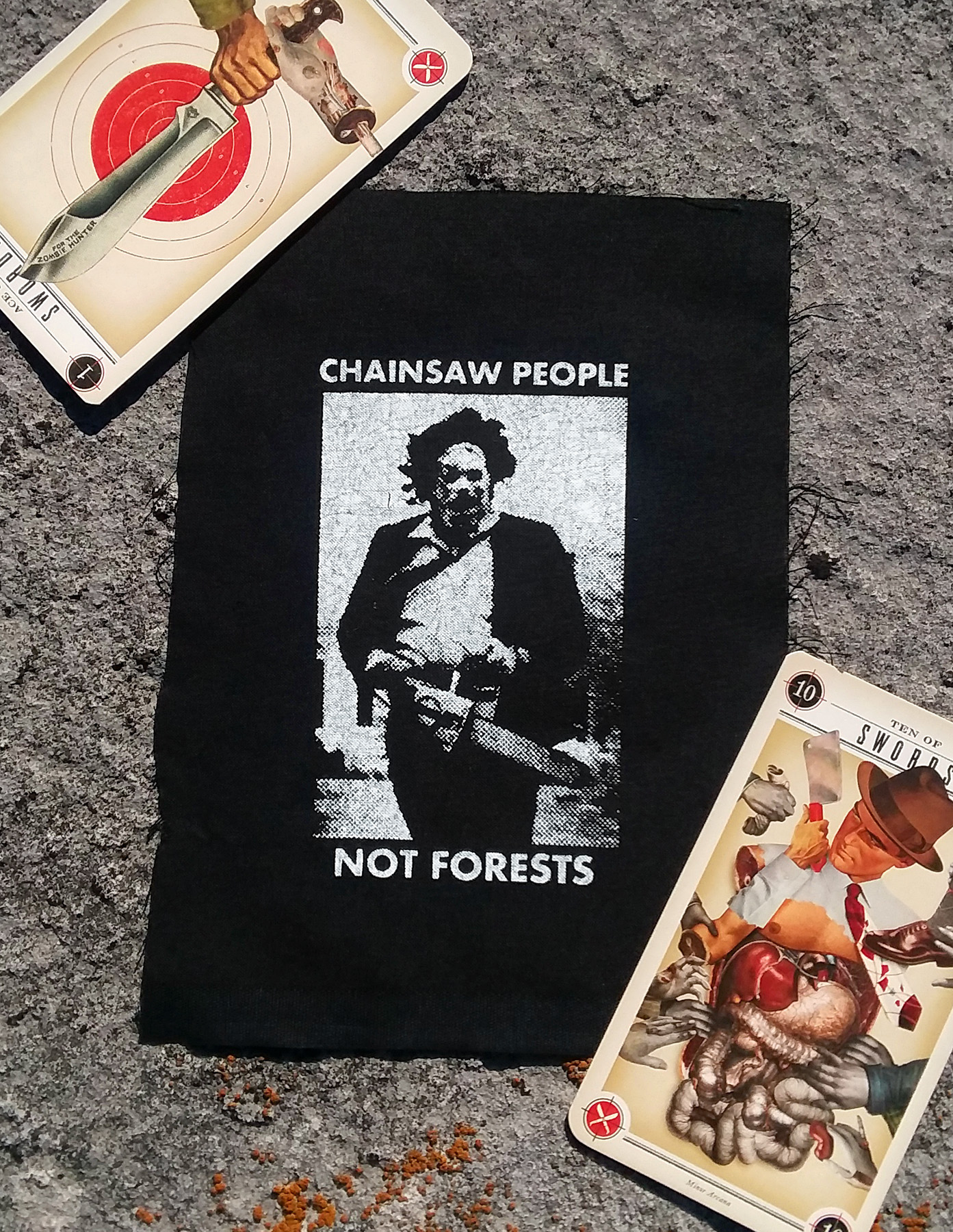 Express your distaste for humans or passion for green things with this super sweet patch featuring everybody's favorite least likely environmental warrior, Leatherface! Designed & printed by VeganPatches. White ink on black fabric, heat set, water safe (so wash your pants, you crusty).