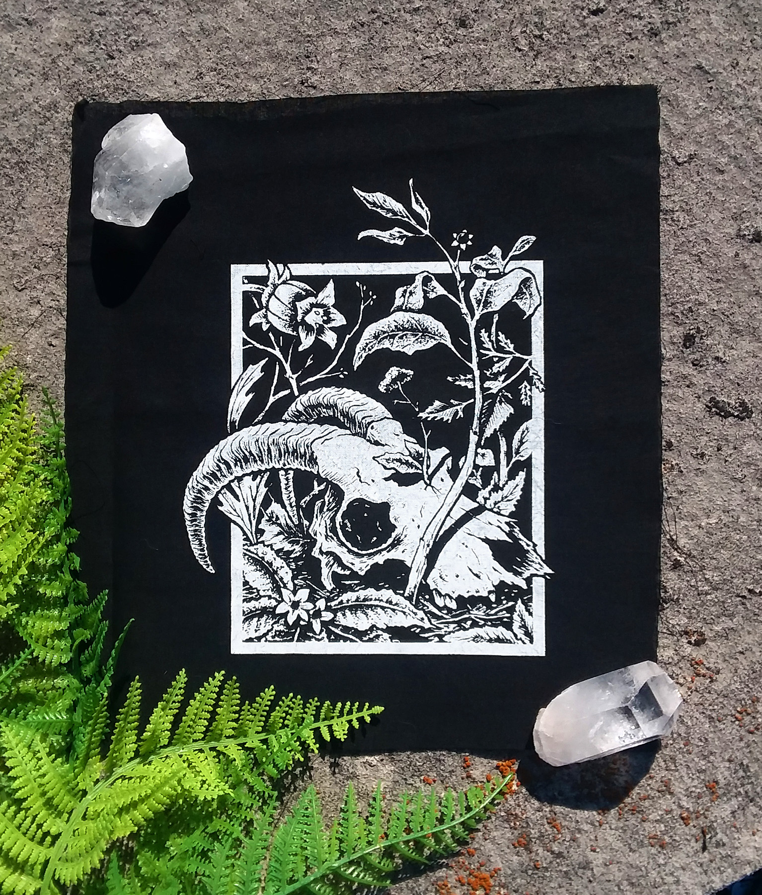 Way bigger than a regular patch but smaller than a full backpatch so you got space to add yr other faves around the edges, it's a goat skull with some leaves & flowers!
