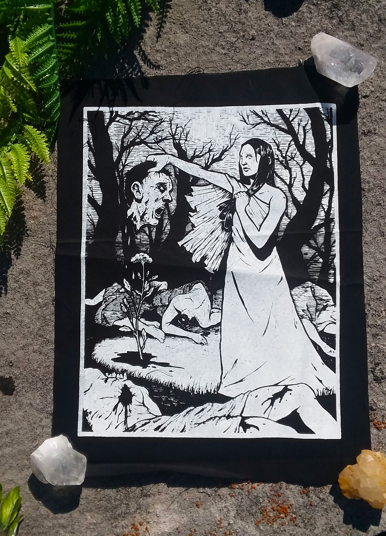 Fun drawing I did in my theme of "mother nature as a witch killing people to keep the earth going" - backpatch, and the image itself is exactly 9 inches wide by 11.5 inches tall. The fabric will, of course, be larger.