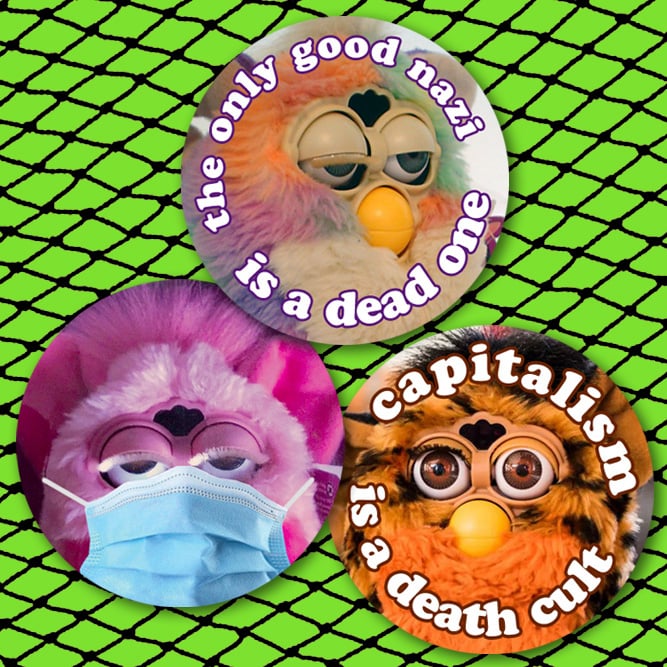 Your choice of three Furbilicious designs--one anti-capitalism, one anti-fascist, and one anti-cooties. Be sure to pick which one you want from the dropdown menu, or buy the whole set and save!