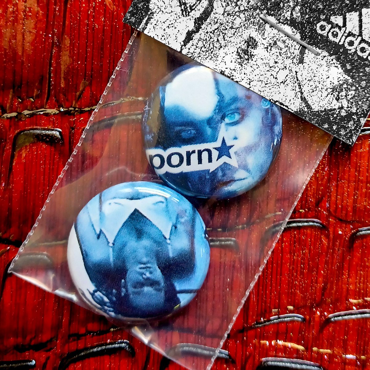 Two stills from K0rn's "A.D.I.D.A.S." video, pin-ified for your enjoyment. These 1" buttons are perfect for lanyards, your work apron, backpack, lapels, etc and will have you feeling like a freak on a leash! Laser printed design, super-shiny mylar, American-made parts. Designed & smashed together by julia eff.