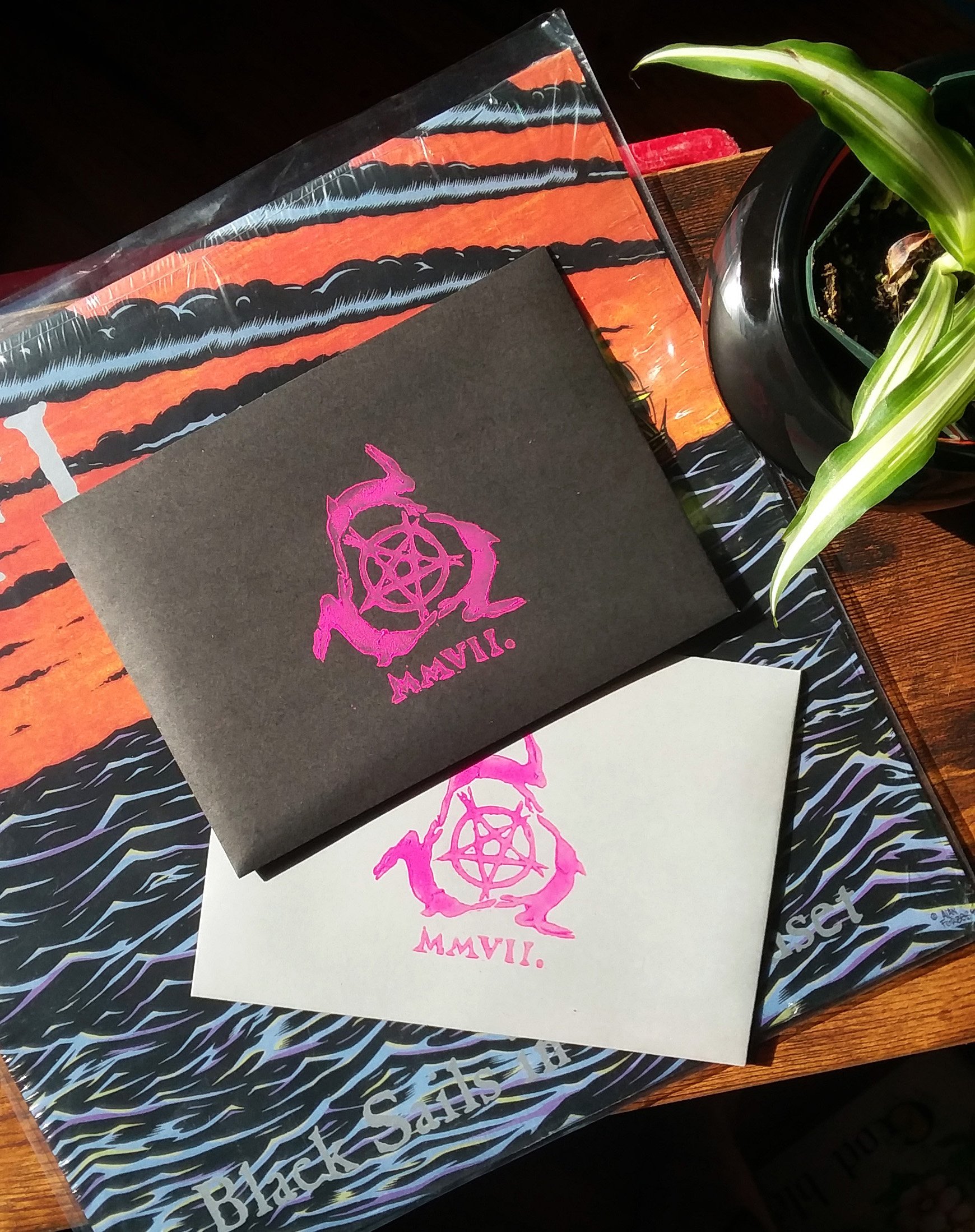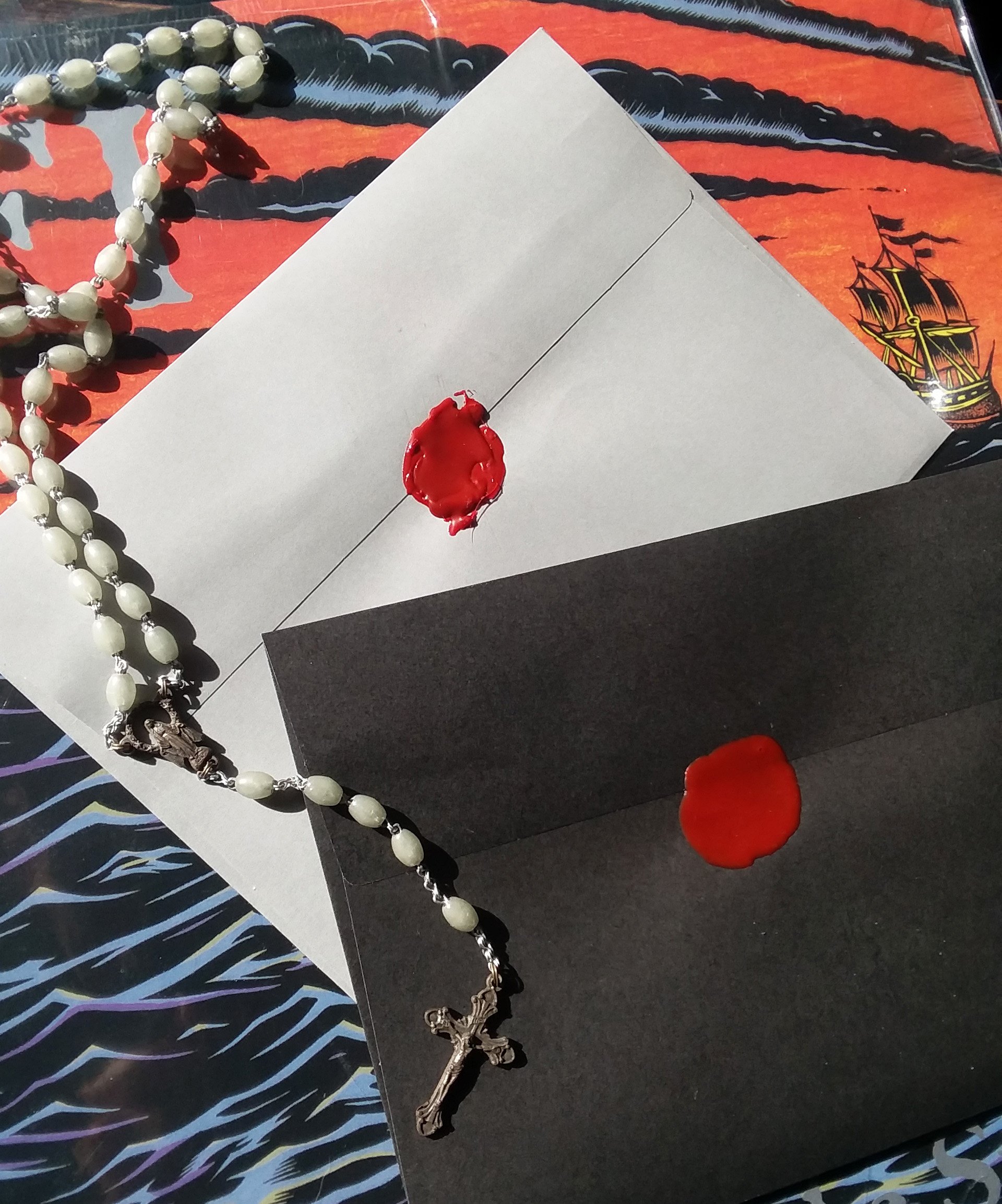 2-sided broadsheet, legal size (8.5" x 14"), typewritten, photocopied, and folded in a handprinted limited edition envelope (silver or black), sealed with red wax.