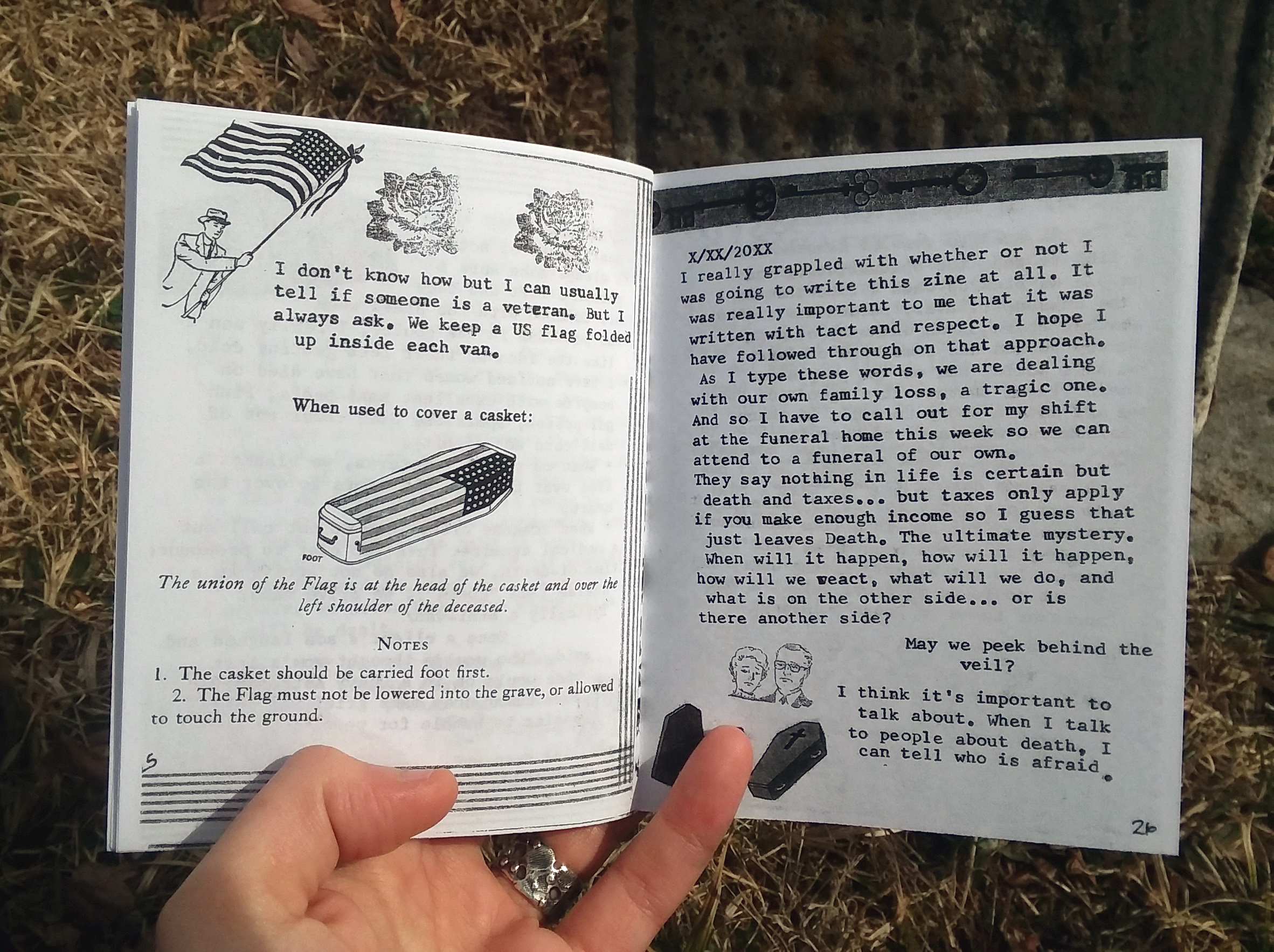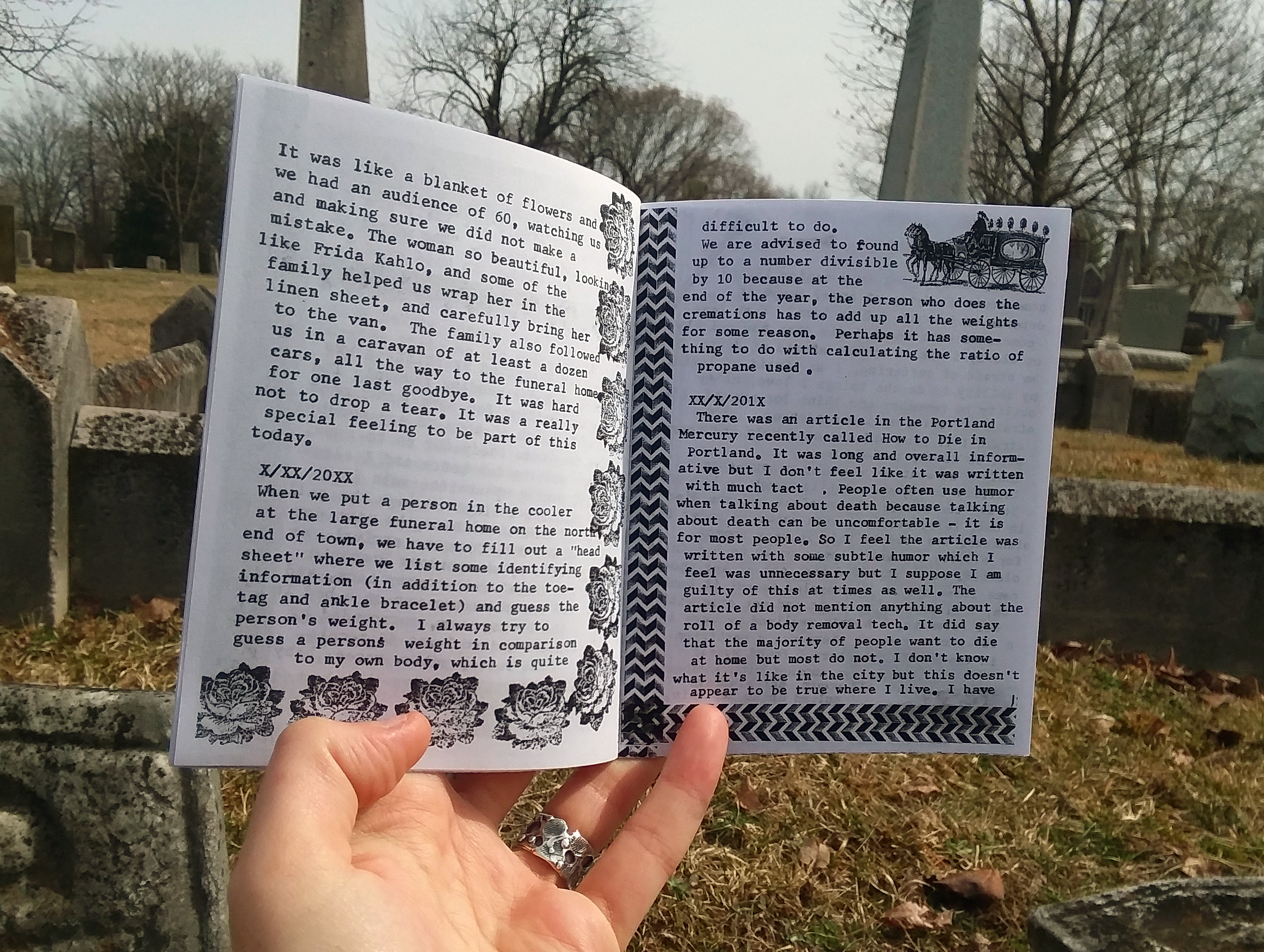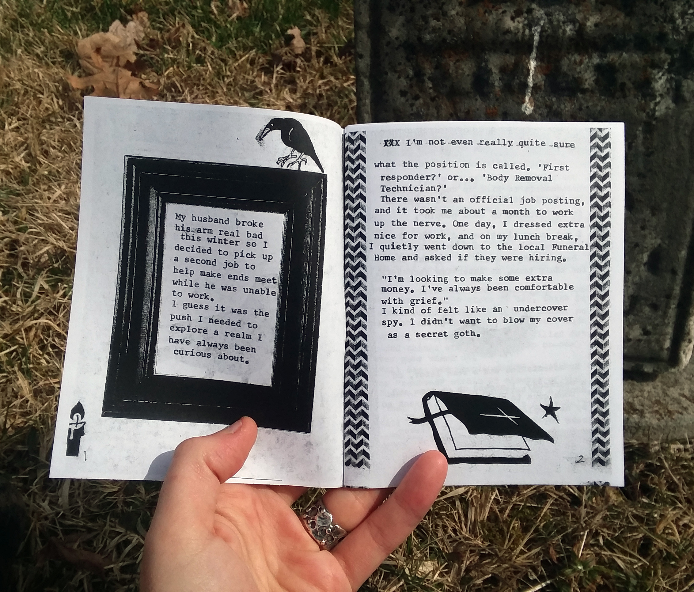 A zine about working on the front lines of the death industry--as a body removal technician. The first ones on the scene when a funeral home receives word there's been a death, body removal techs are responsible for doing just that: picking the deceased up from wherever they are and transporting them to the funeral home. Self-admitted "secret goth" Hazel tells all about the nuts and bolts of the industry and good deaths, sad deaths, mundane deaths, and interesting deaths she saw on the job with nothing but respect and wonder for the world of grief & what it means to us all.