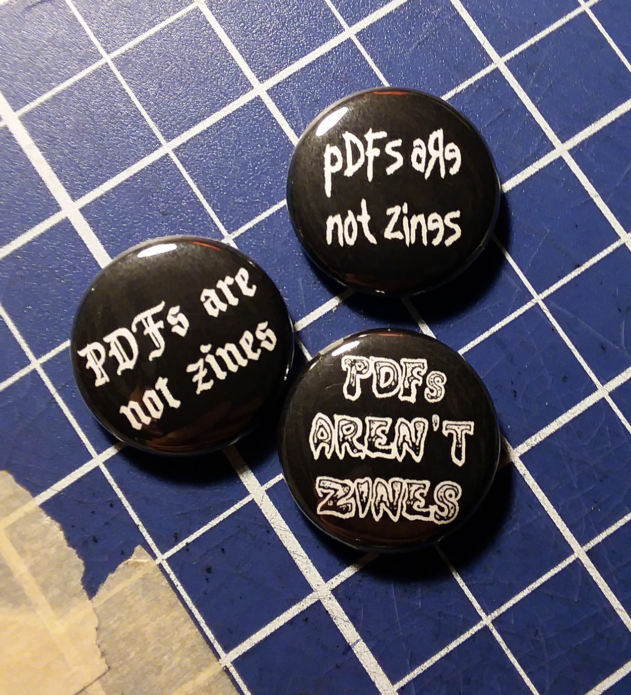 Are you big mad about people selling $18 PDFs and calling them zines? Yeah, us too. Throw it back to the "e-zines are not real zines" discourse days of yore with a new twist on the same old bullshit, in your choice of three designs. Be sure to pick what you want from the dropdown!