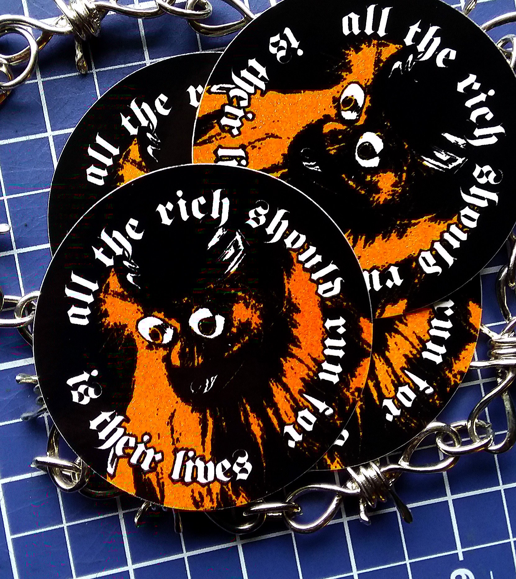 3" round sticker featuring everybody's favorite comrade, screenprinted in violently orange glitter (like seriously. eyesearing. photos cannot convey how ORANGE these are irl) & black on weatherproof vinyl. Nice and sticky!! Sturdy enough for outdoor things!! Design by julia eff.
