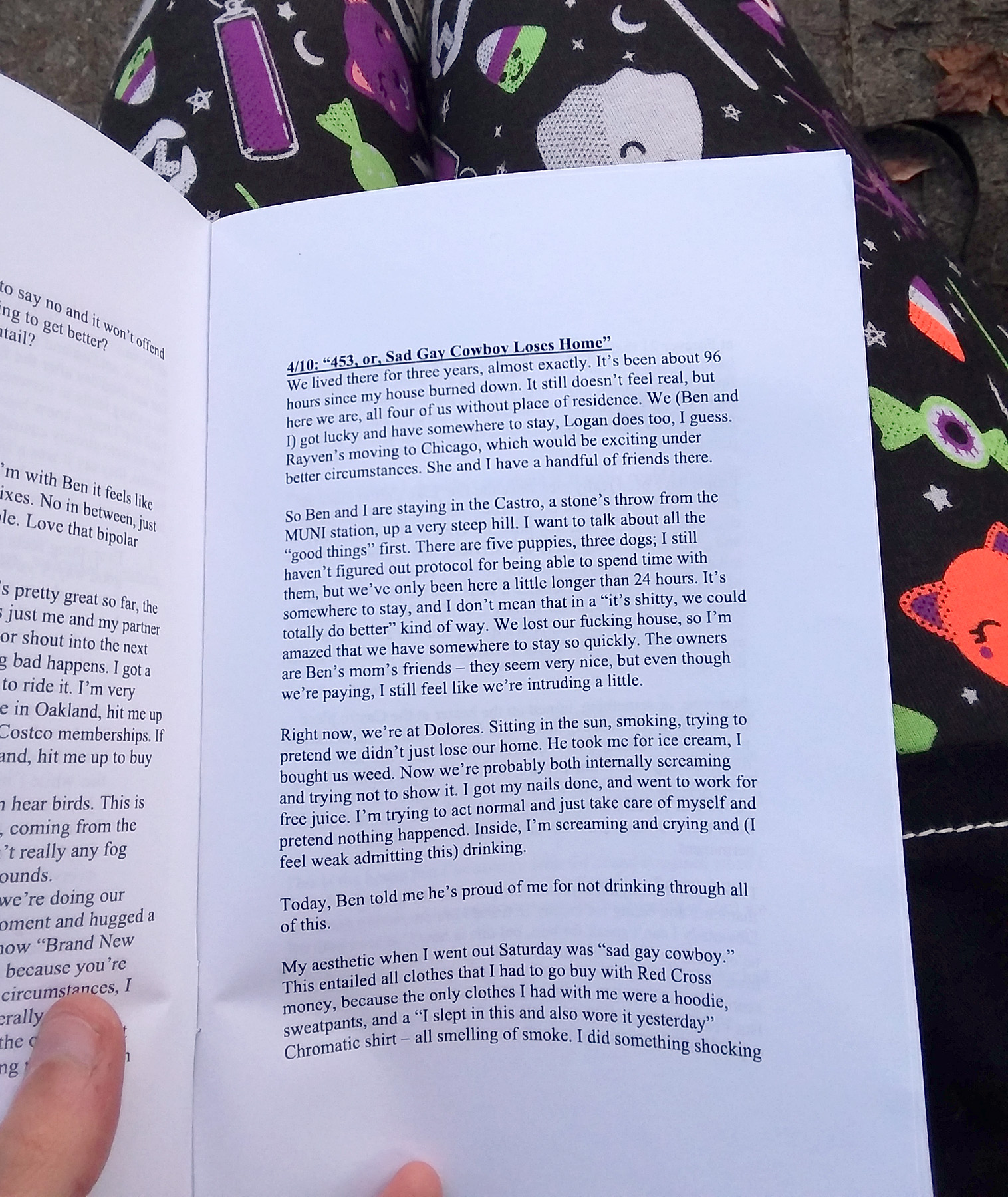 This zine is 16 pages, typed, half size (5.5 x 8.5) & photocopied and comes with a trigger warning for drugs, self-harm, suicidal ideation, house fires, and alcohol. Stay safe out there.