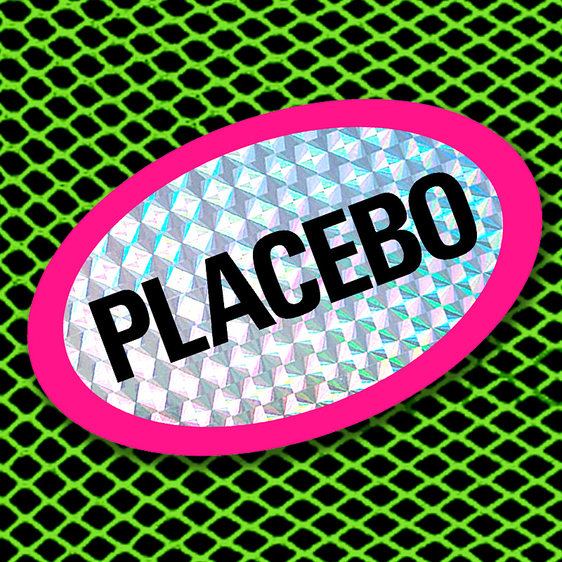 Big-ass Placebo sticker printed in cerise + black on holo prism vinyl. 5 x 3"!!