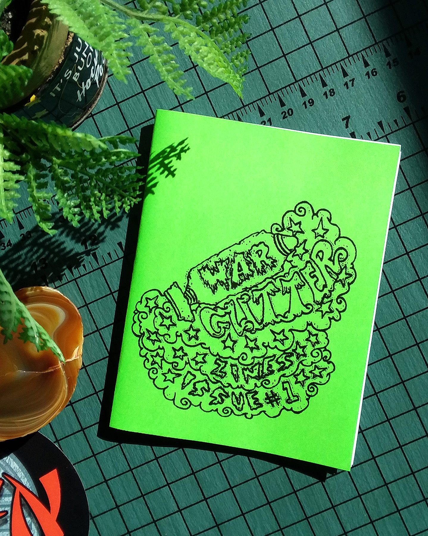 The current batch of this zine is printed on neon green paper all the way through! Groovy!!