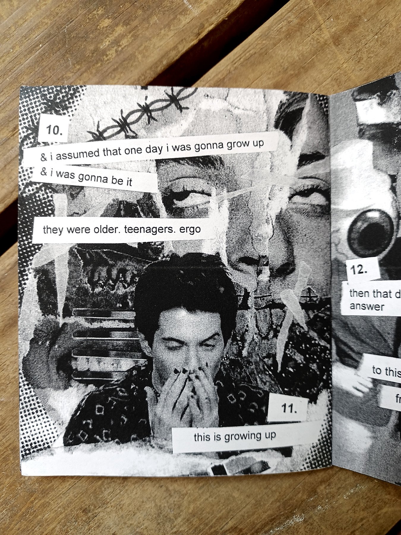 This zine is 16 pages, eighth legal (3.5 x 4.25"), typed, fully collaged by hand, and printed in black & white.
