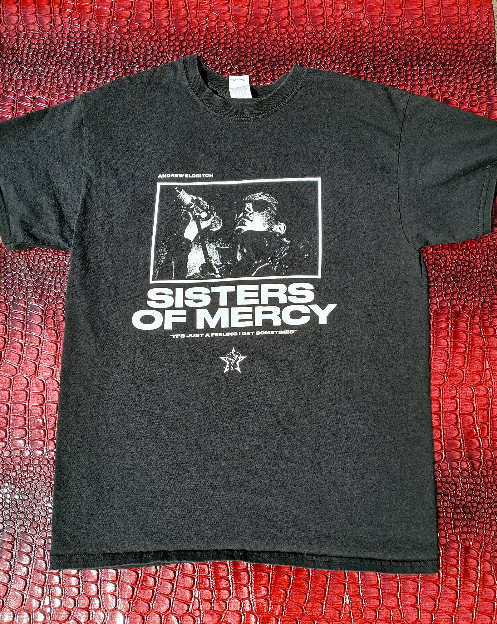 Classic Sisters of Mercy tee featuring a portrait of Andrew Eldritch & "No Time To Cry" lyrics. Tag says medium, but it's roomy & breezy more like a large.