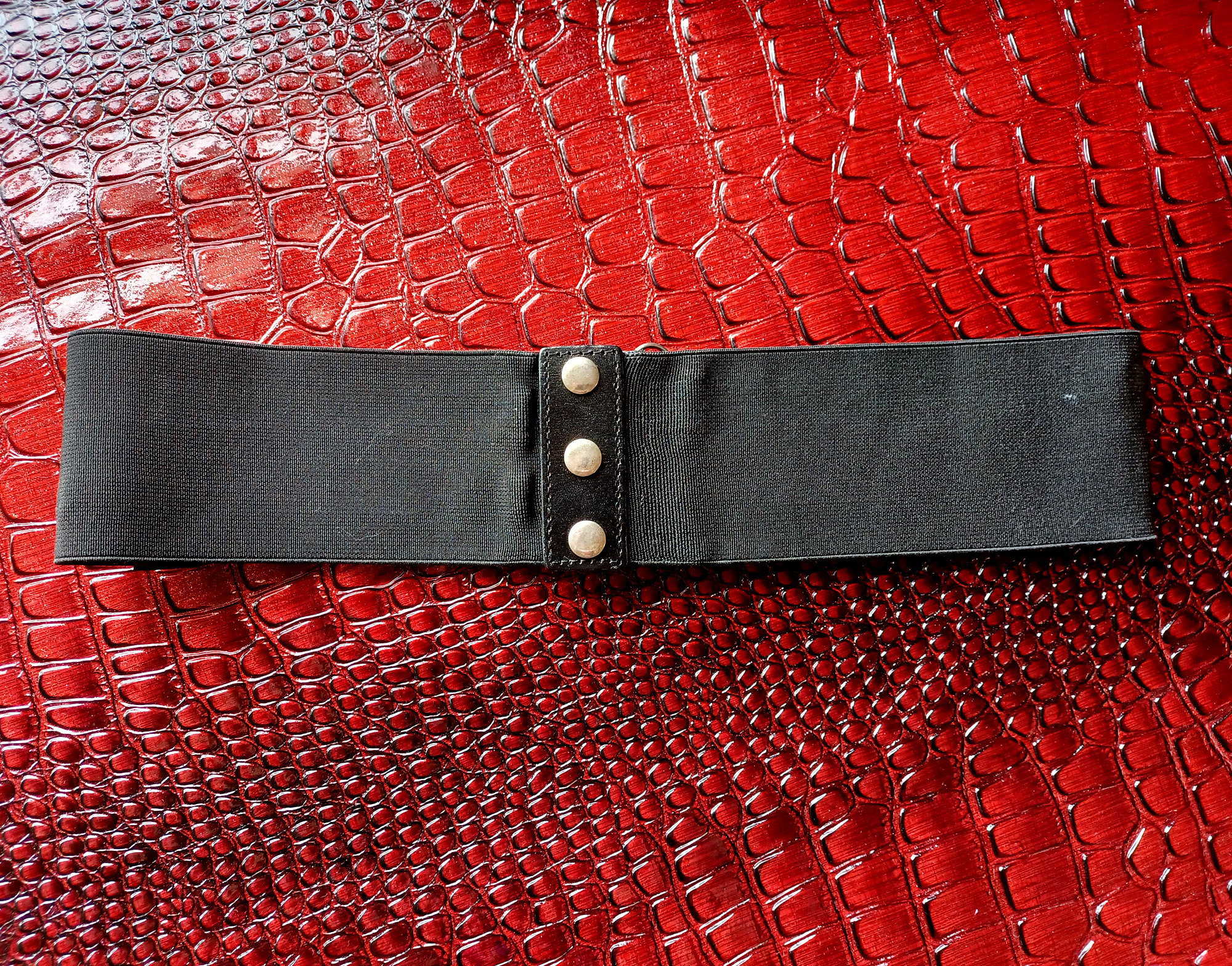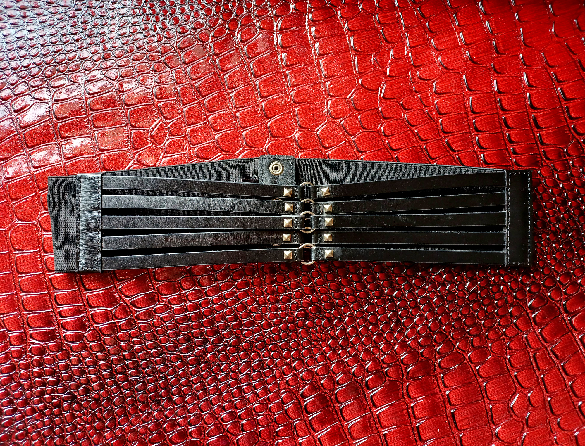 Snap-closure waist cincher/outside belt/what-have-you that's a fun way to add texture & fantasy to any normal top. This puppy has it all--studs, o-rings, slits, pleather....OH MAN.