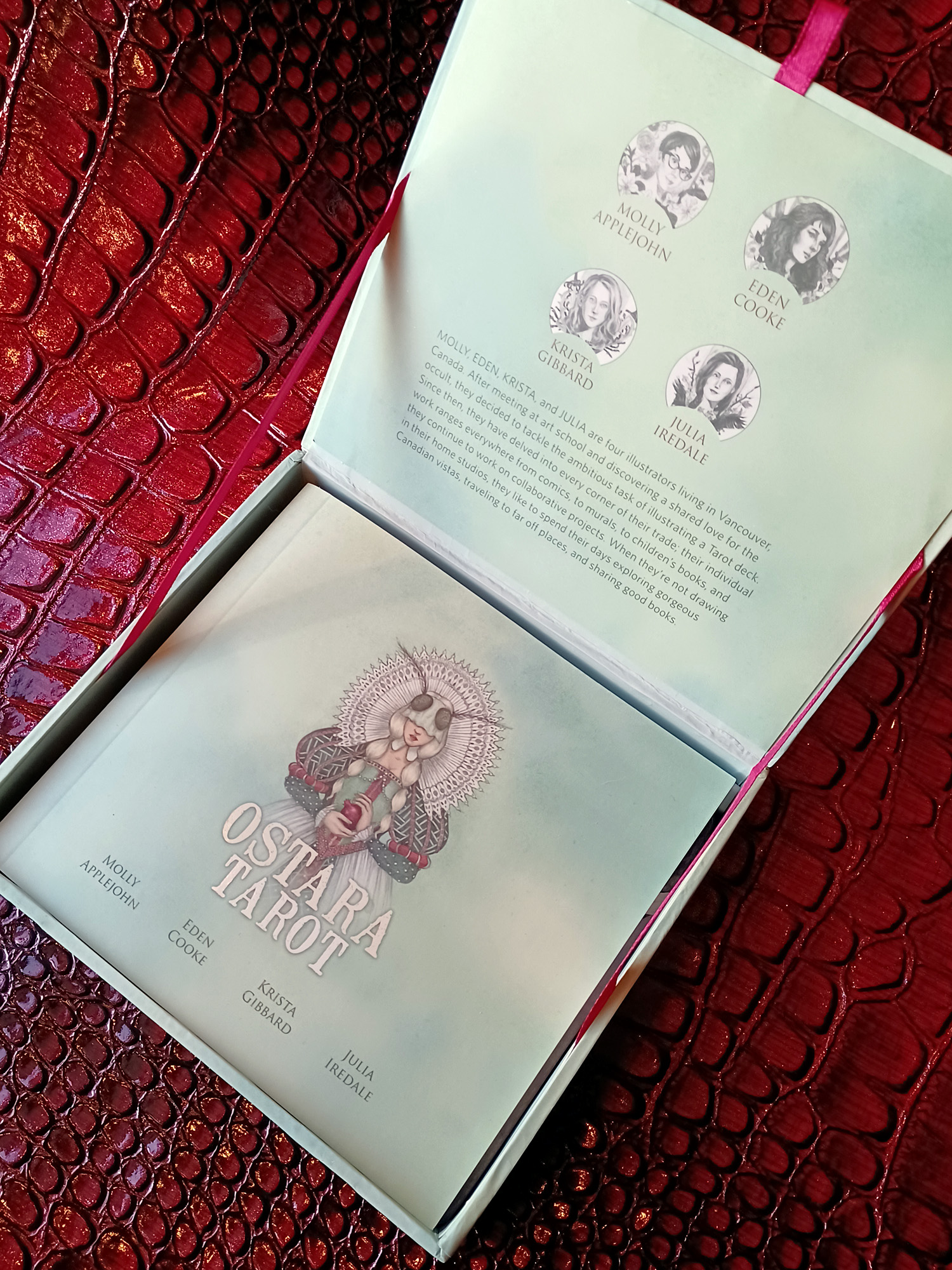 The Ostara Tarot by Eden Cooke, Krista Gibbard, Julia Iredale, & Molly Applejohn. This is a gorgeous deck that feels like a natural dreamscape, with each suit illustrated by a different artist in a way that still feels cohesive. Sturdy box, the most stunning silver foiled edges & a full-color guidebook.