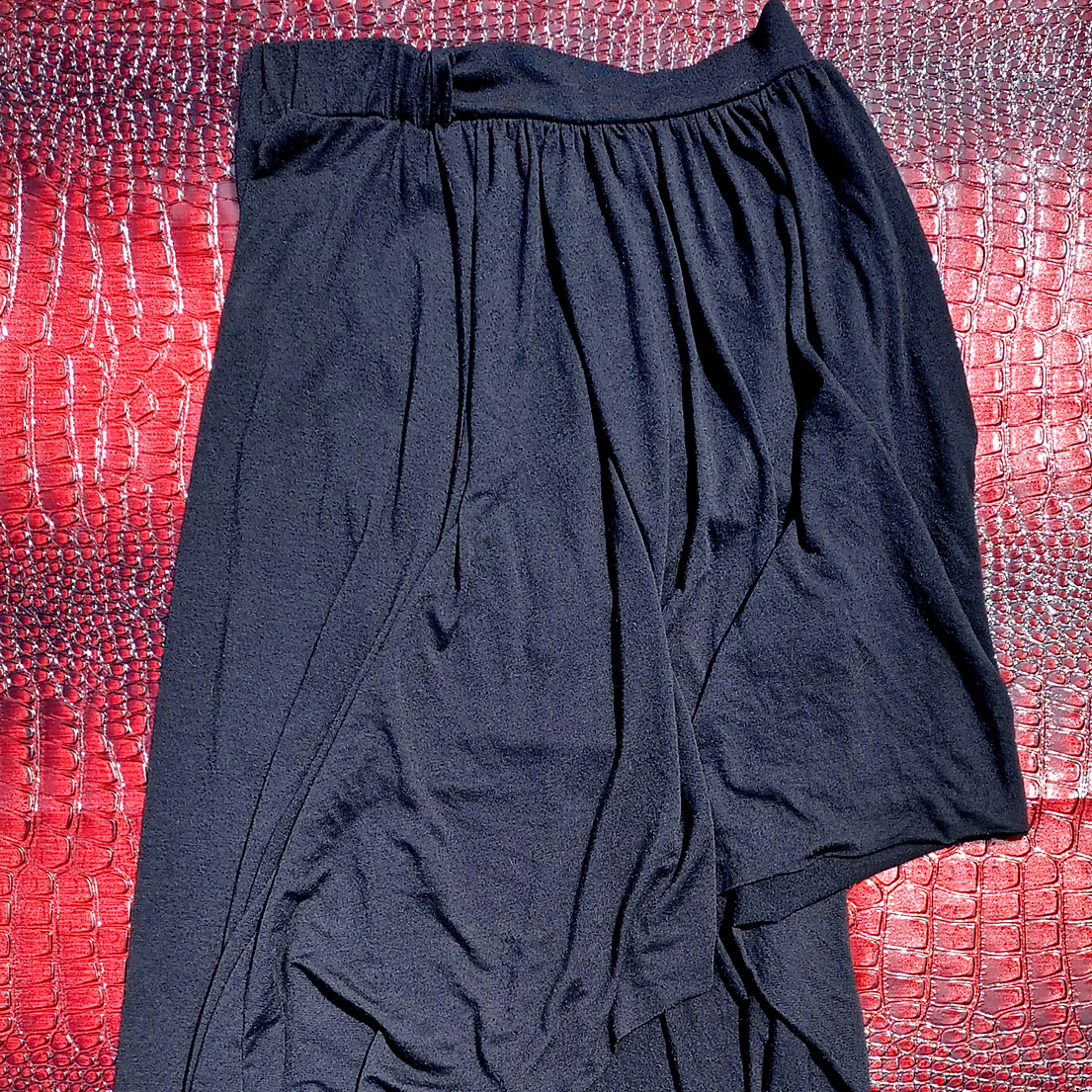 Super comfy asymmetrical/hi-lo skirt with an ultra-stretchy waistband and a liner so your whole biscuits aren't hanging out for the world to see! The skirt part is made of some kind of super-stretch jersey material and the liner is some kind of slippy synthetic. (Say that five times fast.) Great for just chucking in your travel bag too--this thing never gets wrinkly.