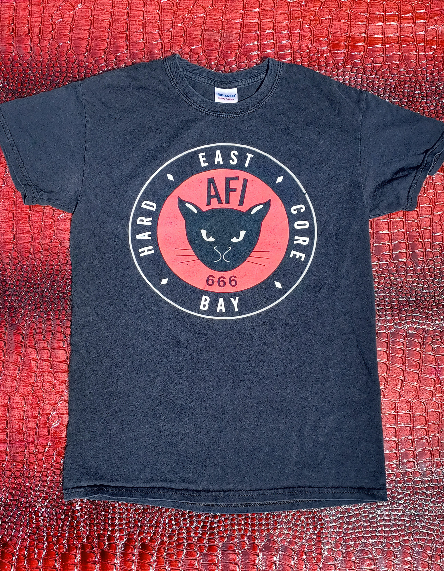 Late-00s print of the AFI "East Bay Hard Core" shirt in absolutely timeless red and white & not whatever weird baby poop color they're printing it in now.