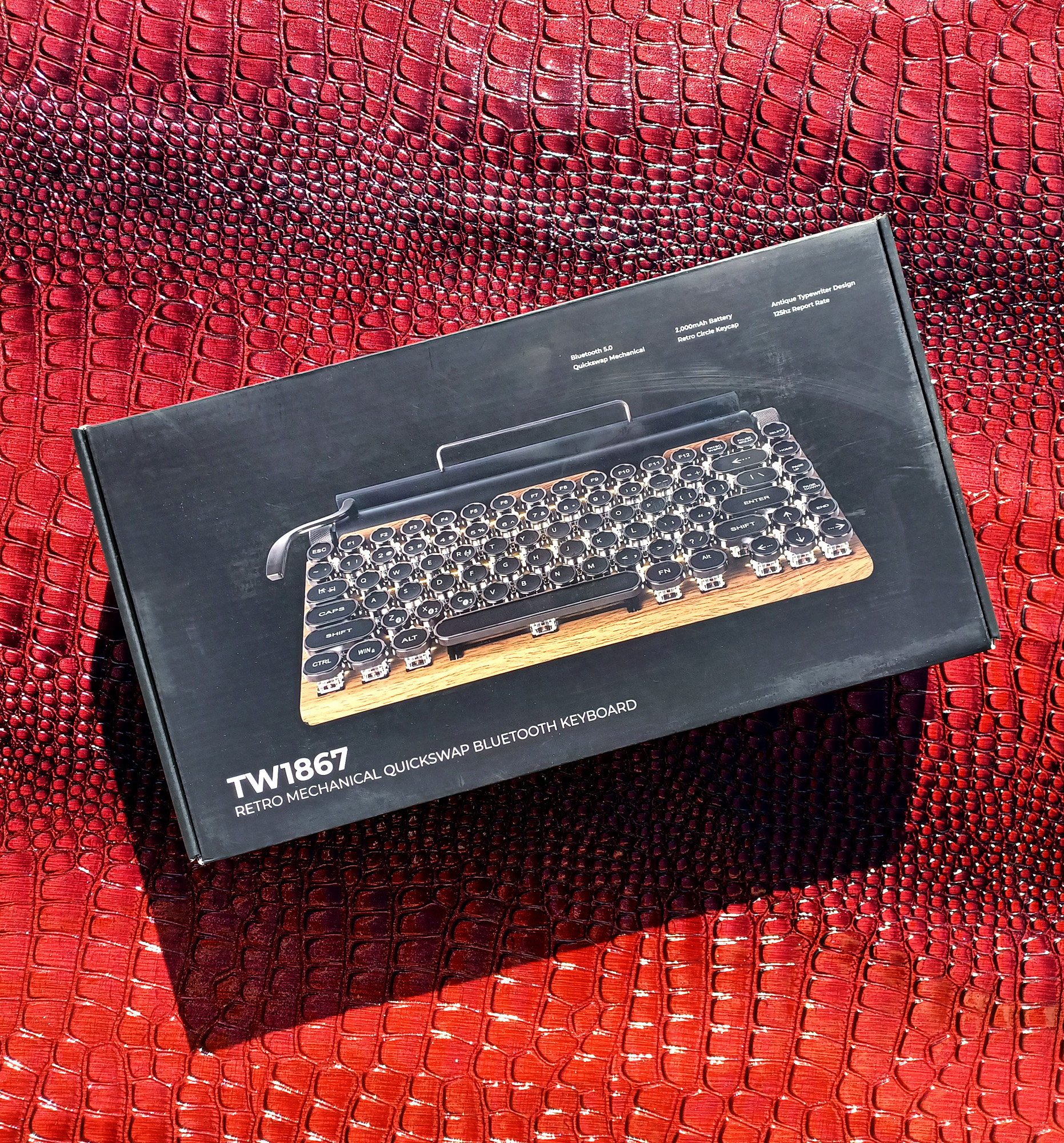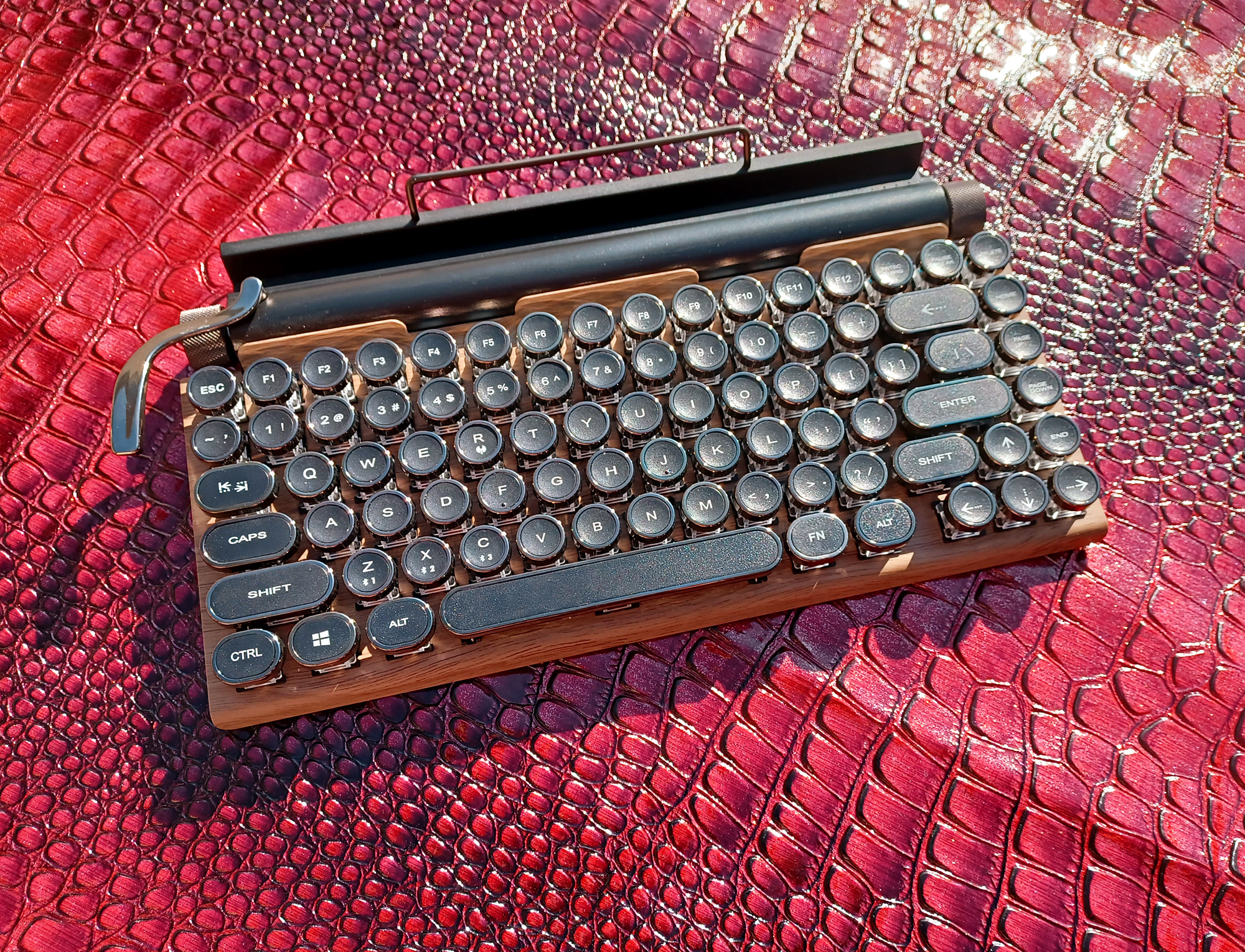 Typewriter-style keyboard by 7Keys that features blue switches (the clicky ones!), multi-device Bluetooth 5.0, adjustable white backlight, and all the trimmings. Rechargeable battery, hotswap sockets, slick woodgrain top plate & FUNCTIONAL METAL KNOBS--it's got the juice.