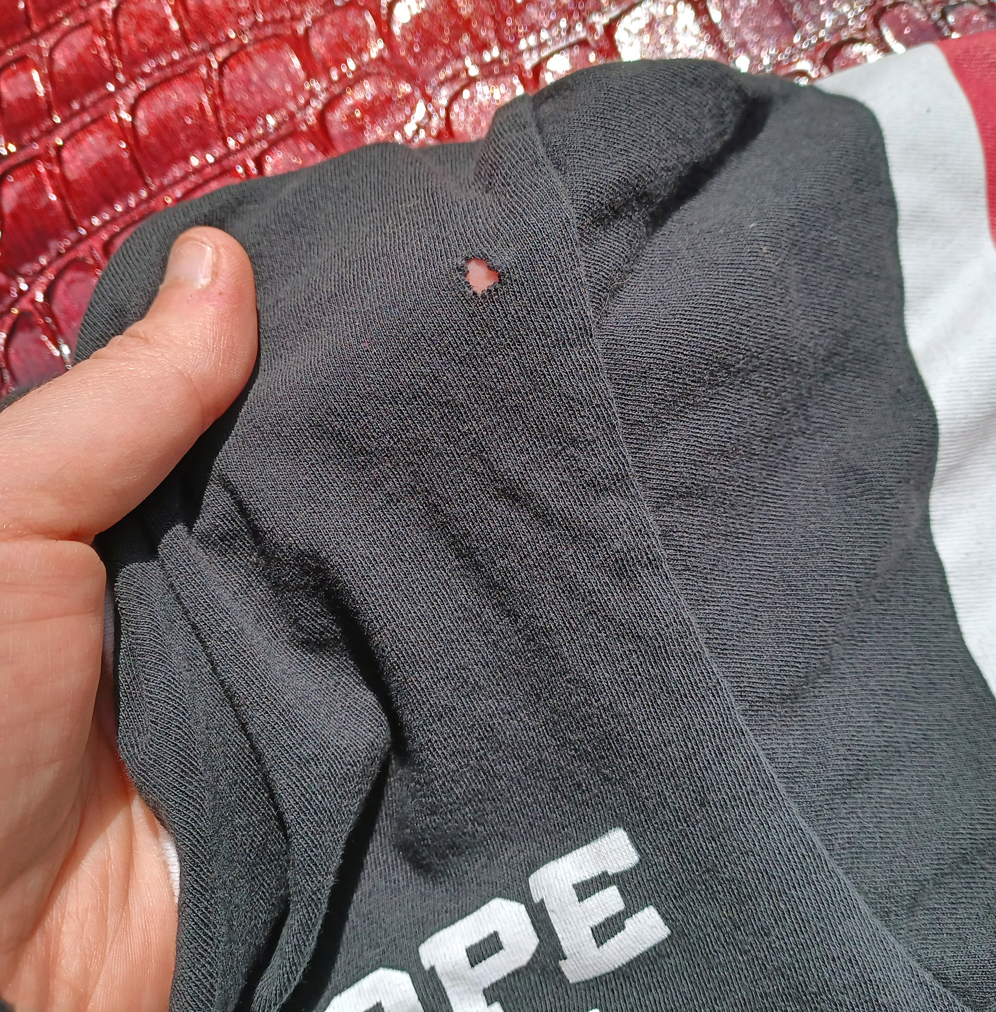 HEADS UP! There's a minor hole near the shoulder seam on the right (left?? our left?? left if you were wearing it? right if you were looking at it as the not-wearer) side. You can leave it, fix it, or throw YOLO to the wind & take the sleeves off too. Or you could even distress it more, because the world is a distressing place!! The possibilities are endless!!